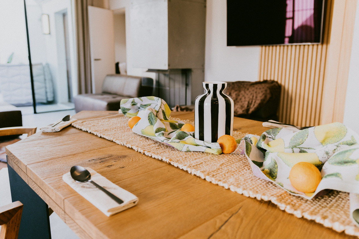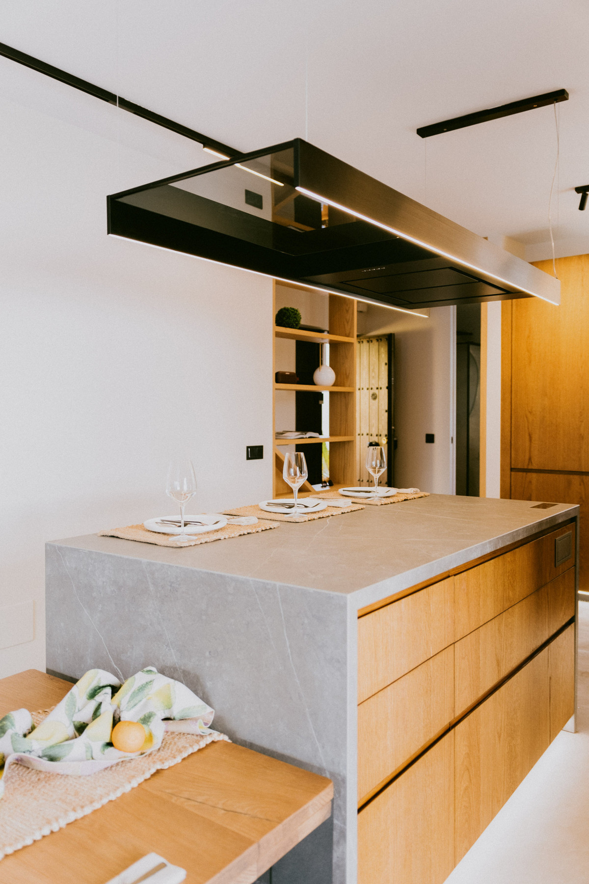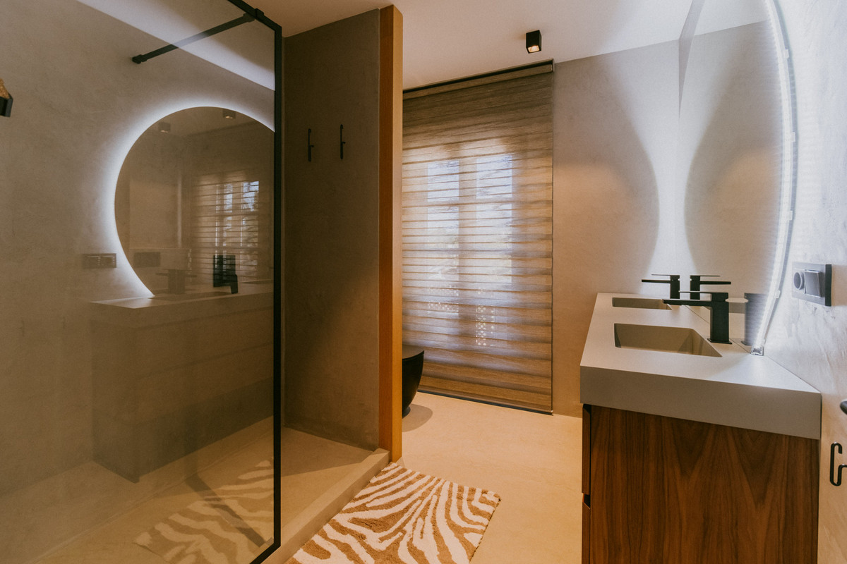 The open-plan living and dining area is bathed in natural light, providing a luxurious yet comfortable space with a real wood fireplace, perfect for relaxing or entertaining. Expansive glass doors lead to a private Andalusian-style patio, offering a serene retreat for outdoor relaxation.