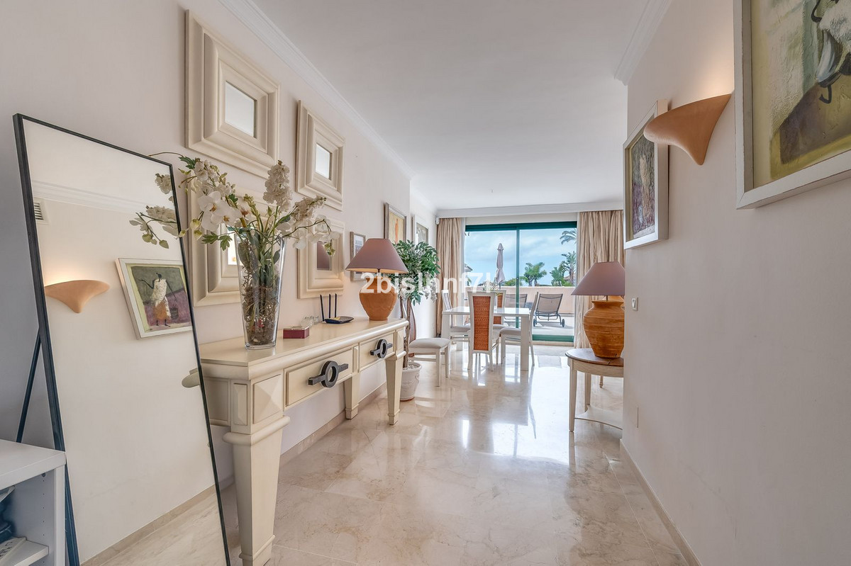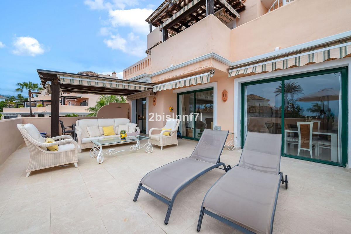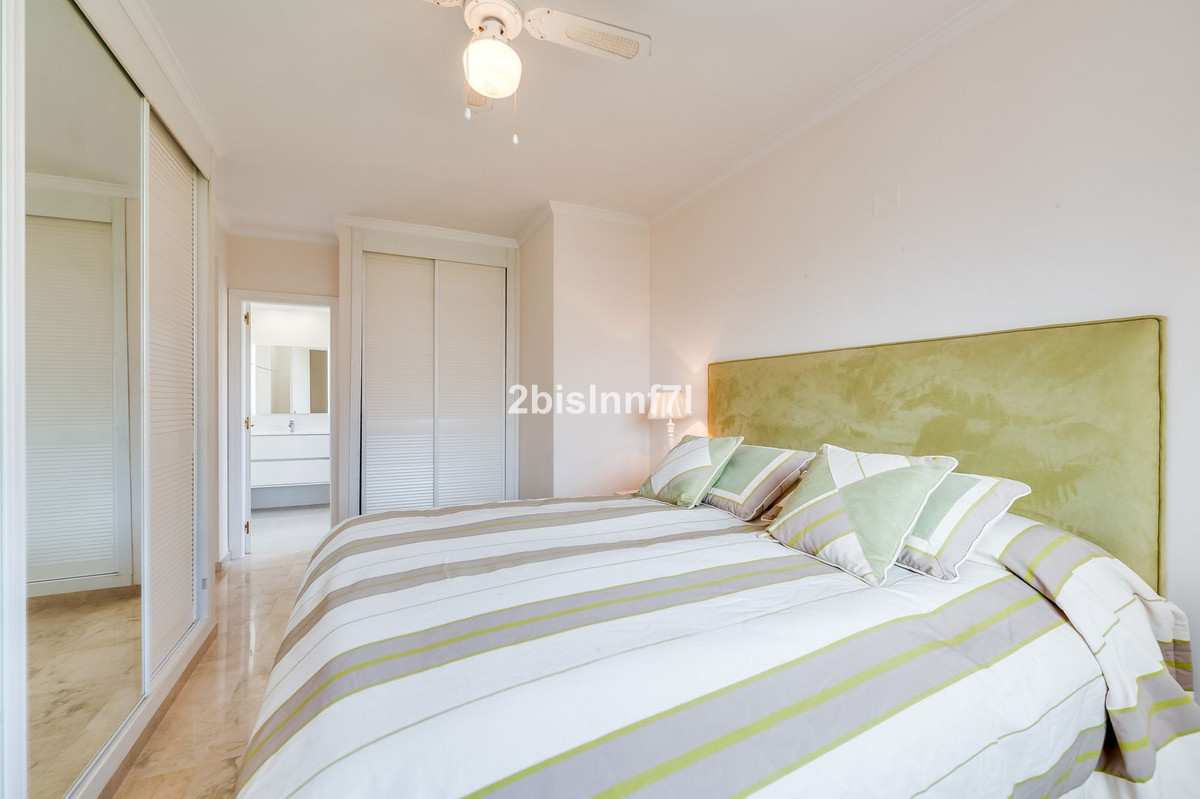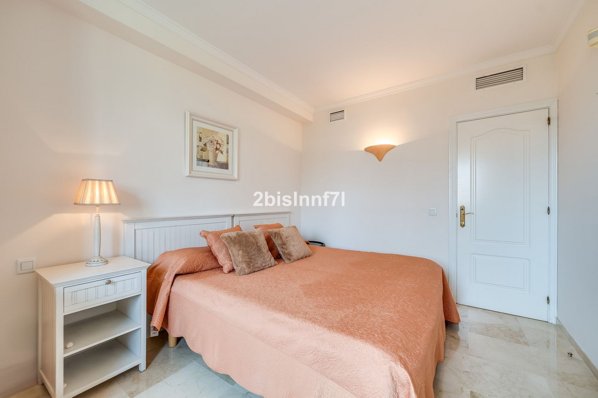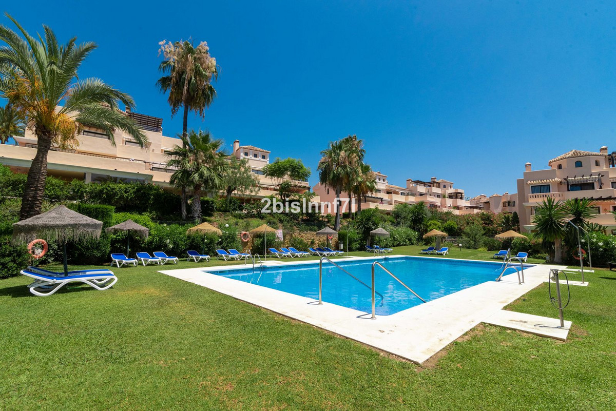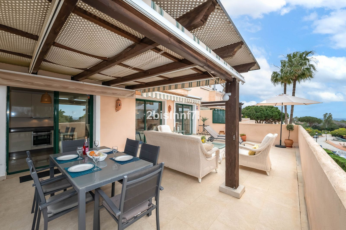 The apartment consists of two generously sized bedrooms and a third smaller one, ideal as a guest room, home office, or children's bedroom. Bedrooms benefits from lovely views of the landscape gardens. The two bathrooms have been renovated and feature underfloor heating for maximum comfort. The kitchen has also been completely renovated with high-end appliances and a modern design. One of the highlights of this property is its spectacular large terrace, with multiple areas to enjoy outdoor living. It features a covered dining space ideal for alfresco meals, a charming chill-out area and a sunbathing zone with longers, all offering beautiful views. Thanks to its excellent orientation, the apartment enjoys sunlight all day long, from 10 AM until sunset. From the terrace you can also enjoy a beautiful sea view on the horizon.