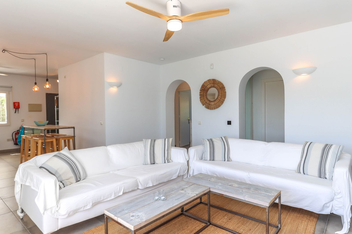Inside, the villa feels refreshingly cool and inviting. The lounge centers around a striking fireplace, adding a cozy touch for winter evenings. The open-plan kitchen seamlessly connects to the living area and extends out to a covered dining terrace, perfectly positioned to overlook the pool.