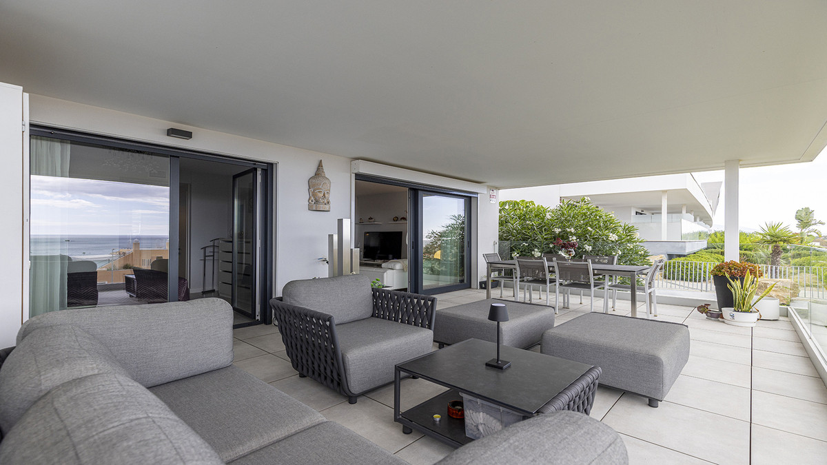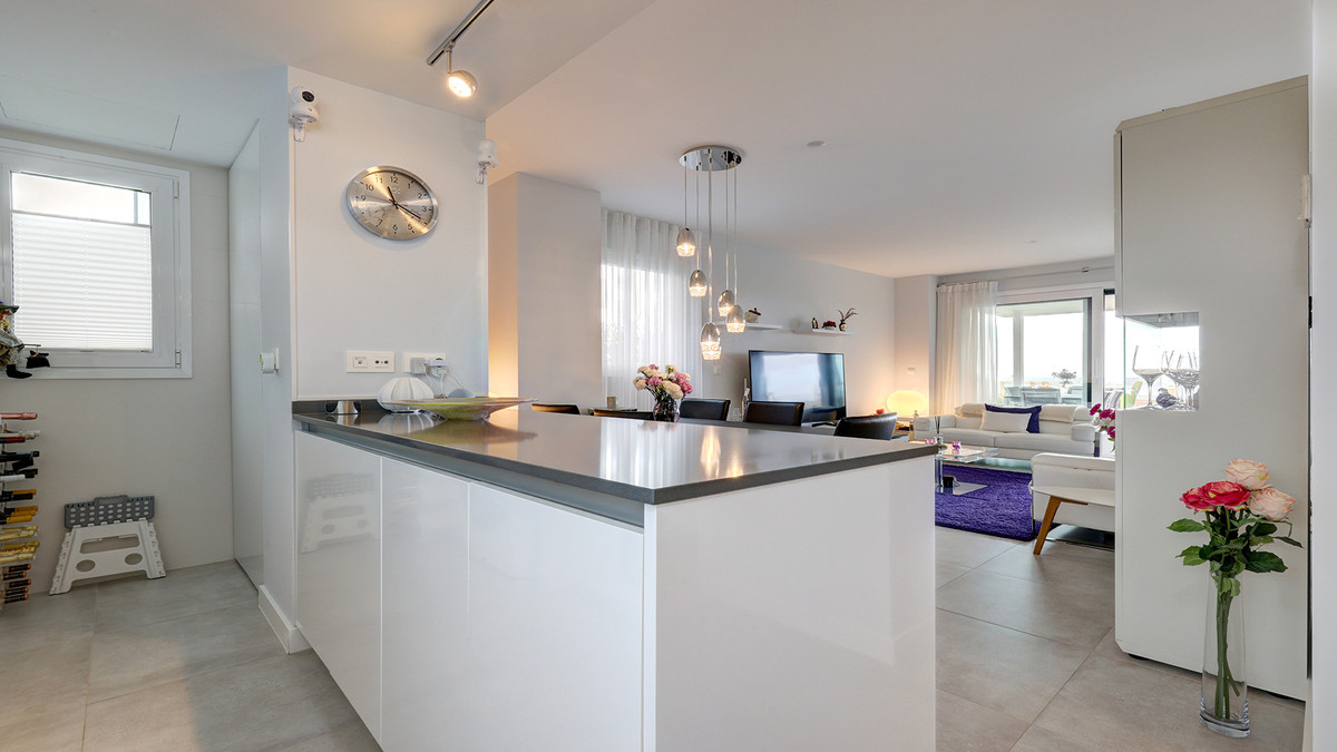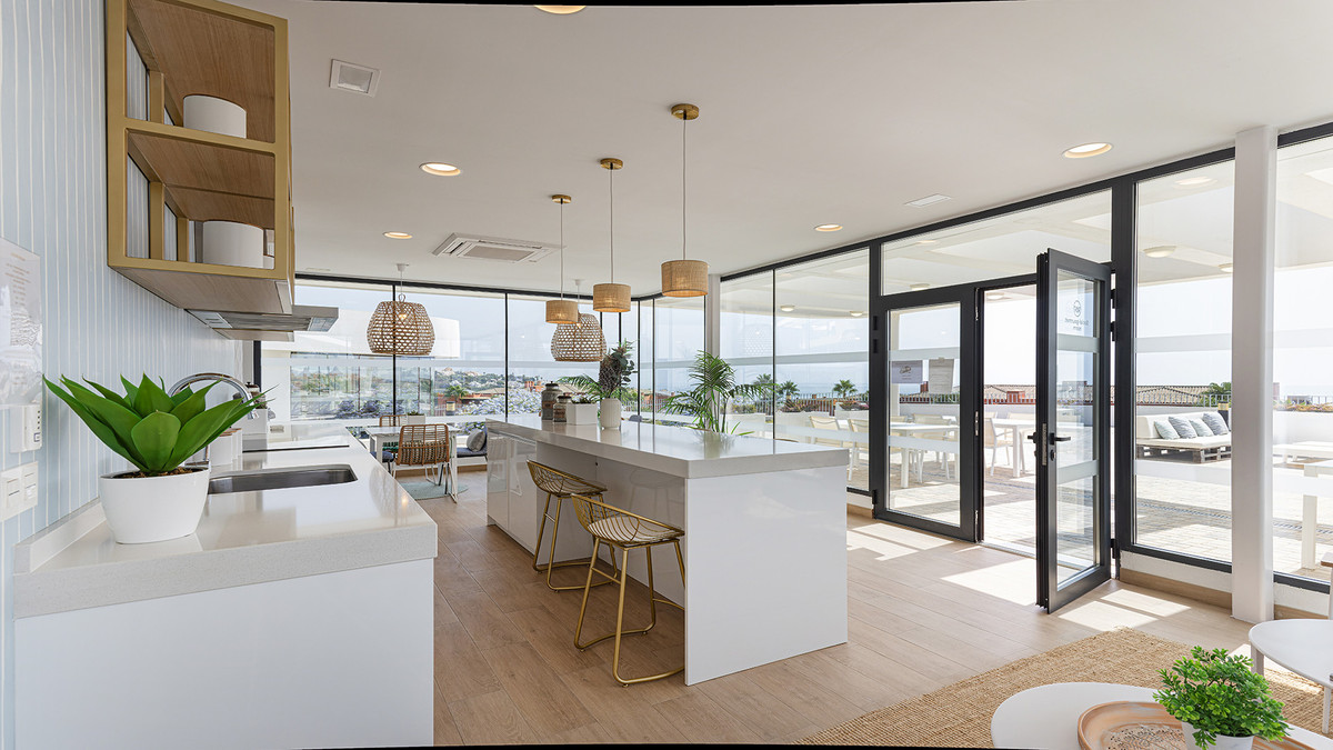 Tout droit, la cuisine ouverte, la salle à manger et le salon sont lumineux et modernes, donnant directement sur la grande terrasse, idéale pour dîner en plein air ou profiter des longs après-midi ensoleillés espagnols tout en profitant de la vue imprenable sur la mer.