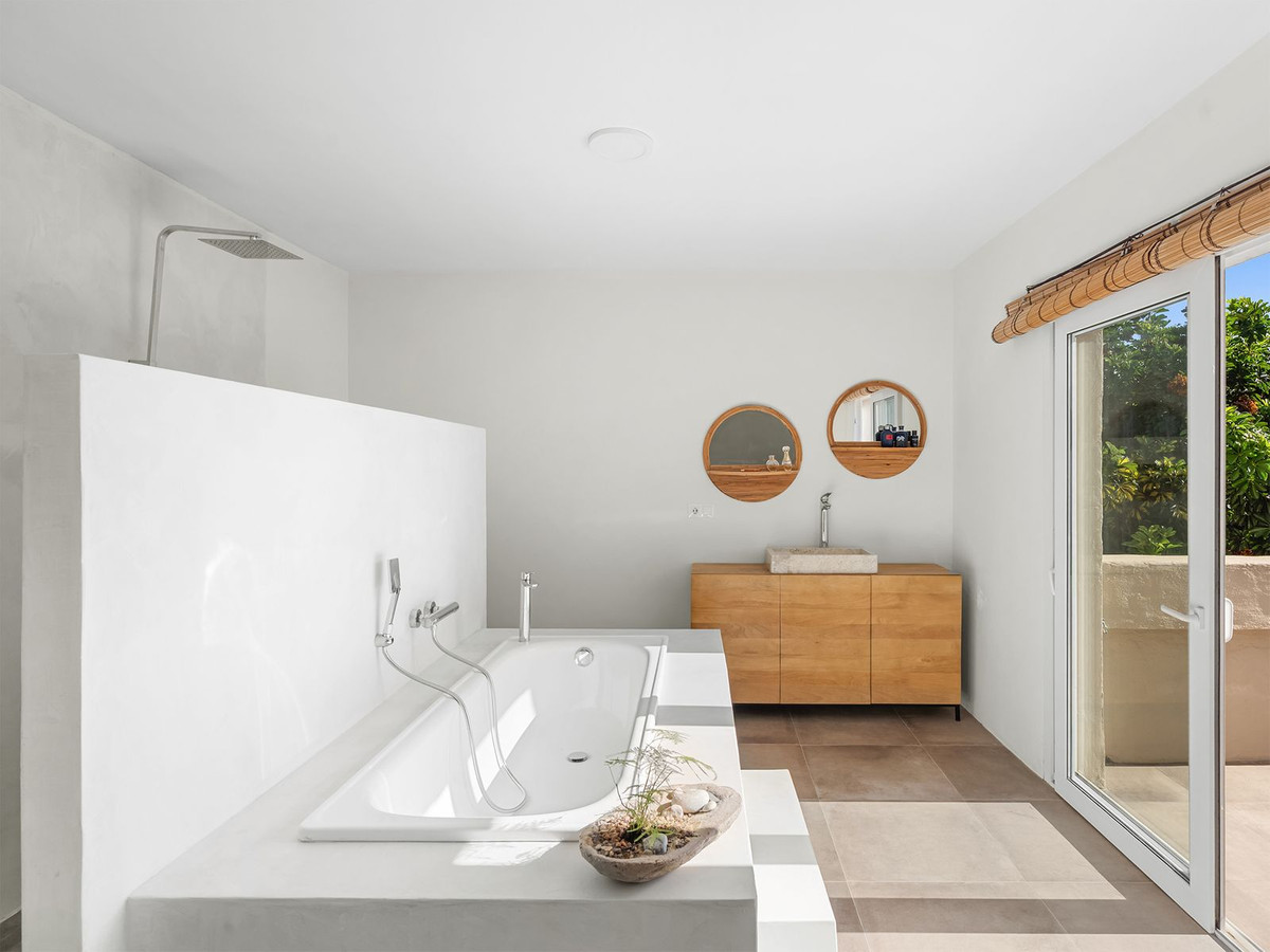 À l'intérieur, la villa comprend deux chambres, dont une facilement transformable en trois chambres, deux salles de bains, dont une spacieuse suite parentale à l'atmosphère authentique d'un hôtel, véritable havre de paix. L'agencement lumineux et ouvert crée une atmosphère chaleureuse, idéale pour se détendre et recevoir.