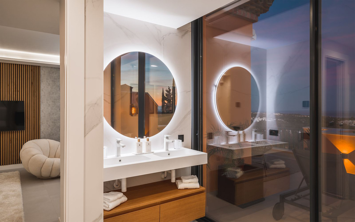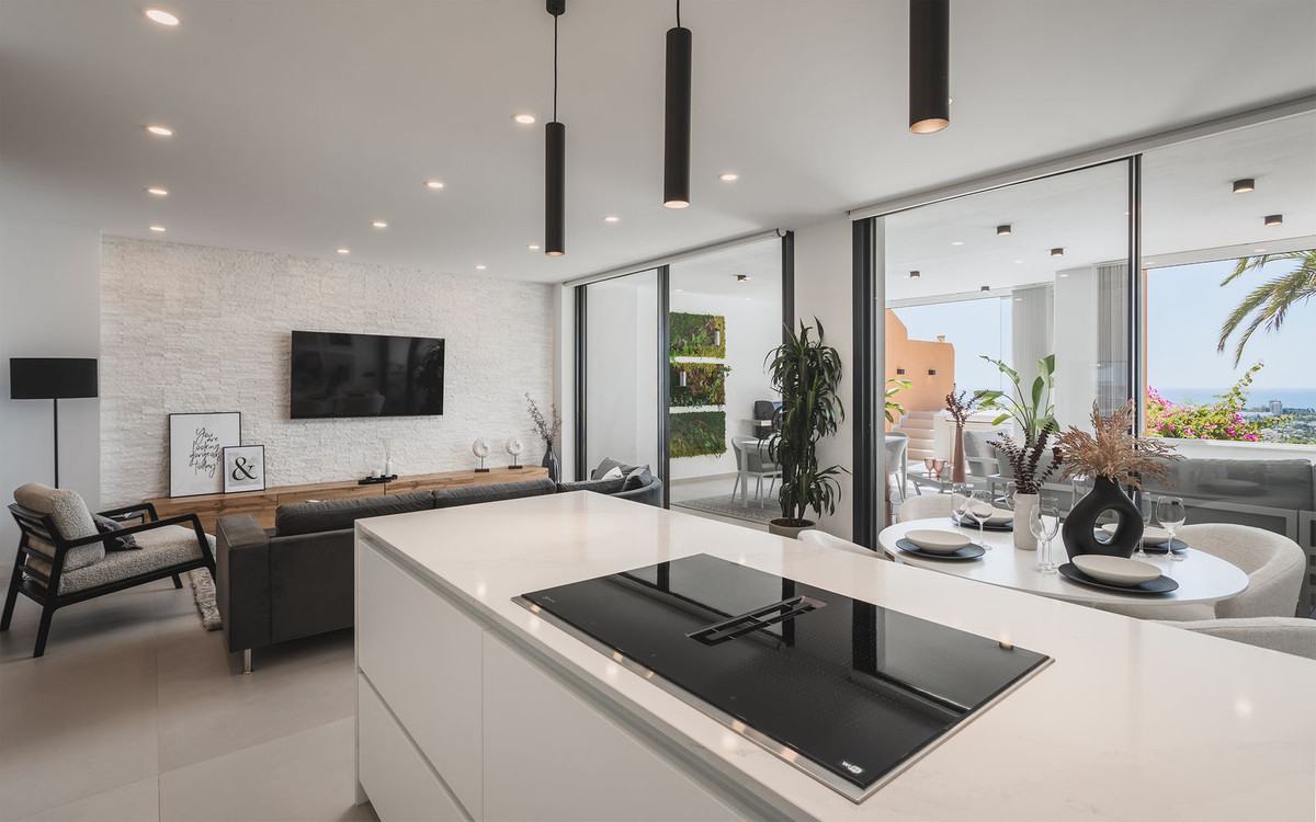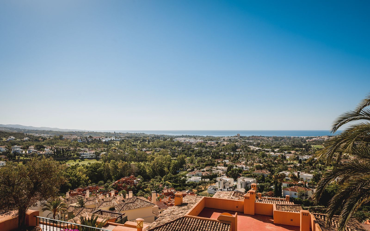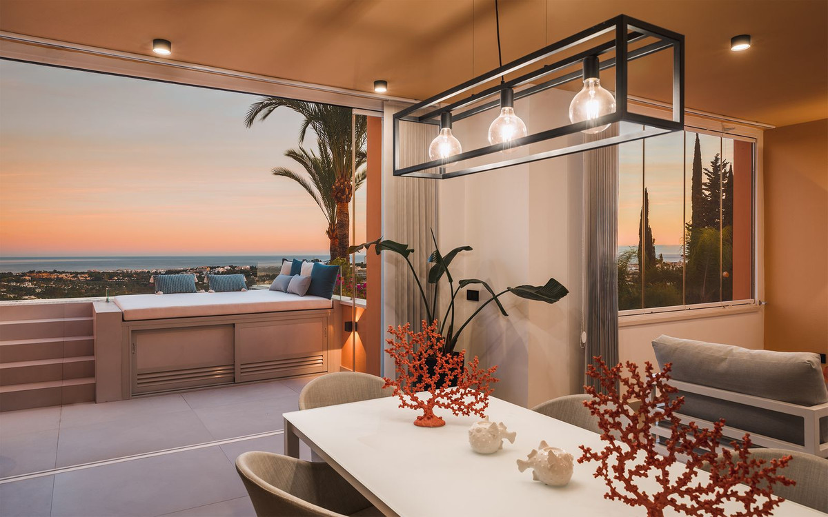 Spectaculaire penthouse en duplex entièrement rénové avec vue panoramique imprenable sur la mer, les montagnes et la vallée du golf à Los Belvederes, une résidence fermée réputée de La Cerquilla, Nueva Andalucia, avec sécurité 24h/24, jardins communs arborés, piscine, 2 courts de tennis (actuellement en discussion pour convertir l'un d'eux en 2 courts de paddle) et une salle de sport avec sauna. La propriété occupe tout le dernier étage de l'immeuble et comprend une impressionnante entrée avec vestiaire et petite cave à vin, menant au salon/salle à manger avec vue panoramique sur la mer et accès à une terrasse couverte menant à une terrasse découverte avec bassin profond/jacuzzi ; une cuisine ouverte avec appareils électroménagers Neff haut de gamme ; et une chambre d'amis avec salle de bain attenante et dressing. À l'étage : une chambre principale double avec salle de bain attenante, cheminée, dressing et accès à une terrasse découverte avec stores électriques, bénéficiant des meilleures vues ; une chambre d'amis avec salle de bain attenante ; et une buanderie. Les autres caractéristiques comprennent : la technologie aérothermique Daikin ; Chauffage au sol (eau chaude) dans toute la maison ; système audio Sono dans toute la maison ; climatisation réversible avec régulateurs de zone. La propriété comprend une place de parking et