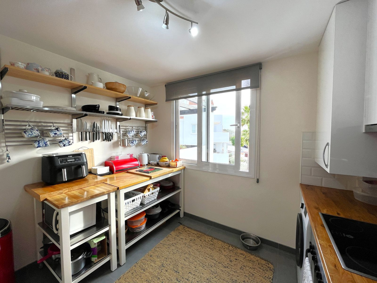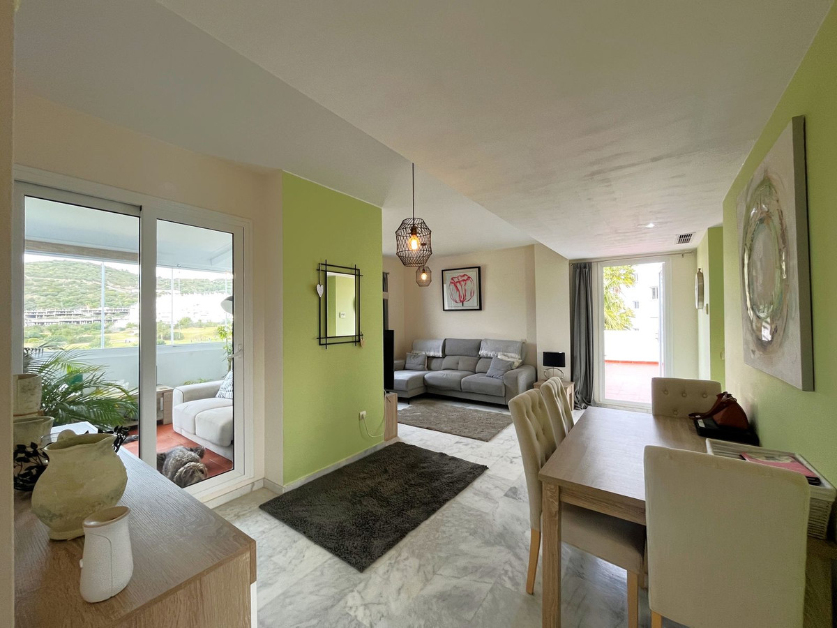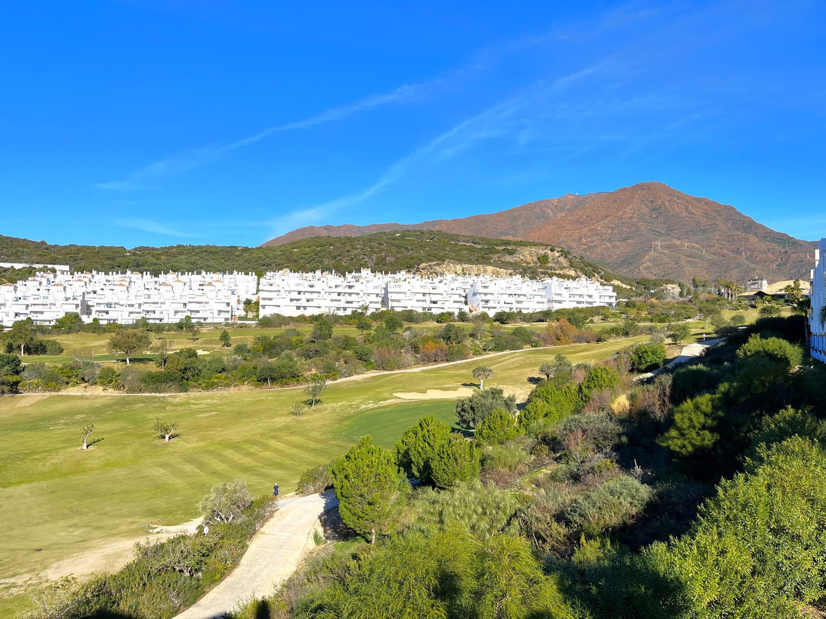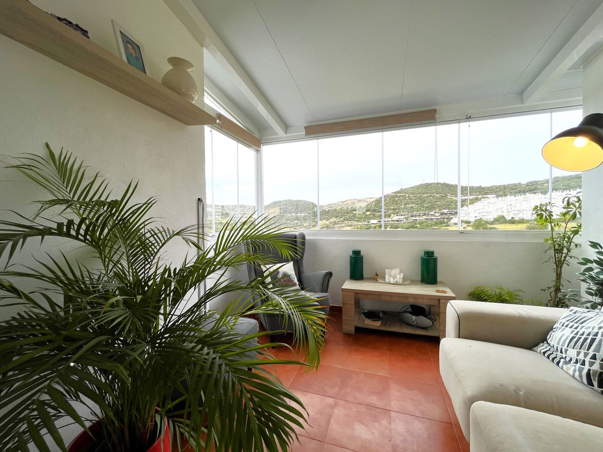 La propriété se distingue par sa grande terrasse panoramique offrant une vue imprenable sur le golf et les montagnes, l'endroit idéal pour profiter du soleil et de la tranquillité. Dès l'entrée, vous découvrirez un salon-salle à manger lumineux et spacieux donnant sur une terrasse vitrée avec rideaux coulissants, idéale comme espace de vie supplémentaire. La cuisine entièrement rénovée et équipée offre des finitions haut de gamme.