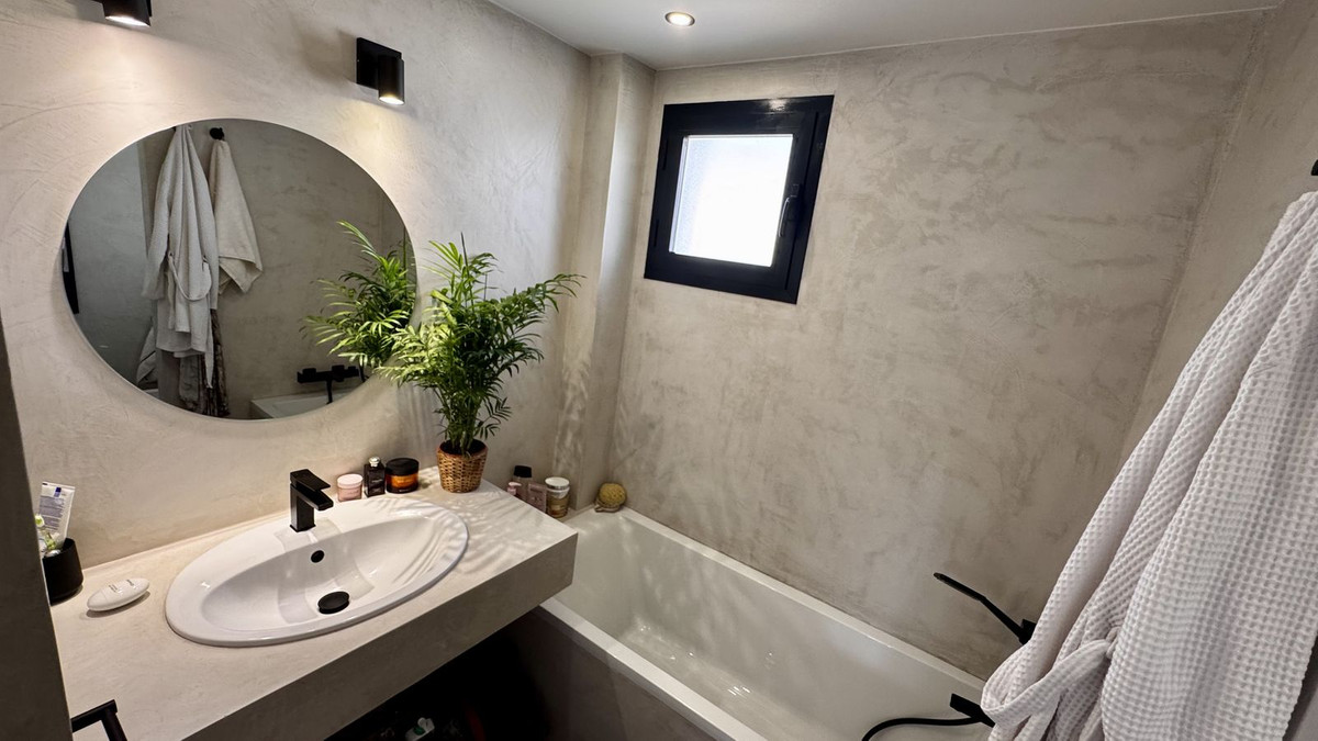 L'appartement comprend trois chambres spacieuses, dont une suite parentale avec salle de bain attenante, tandis que les deux autres partagent une deuxième salle de bain rénovée avec goût. Les deux salles de bain sont équipées de radiateurs et la maison bénéficie de la climatisation réversible.