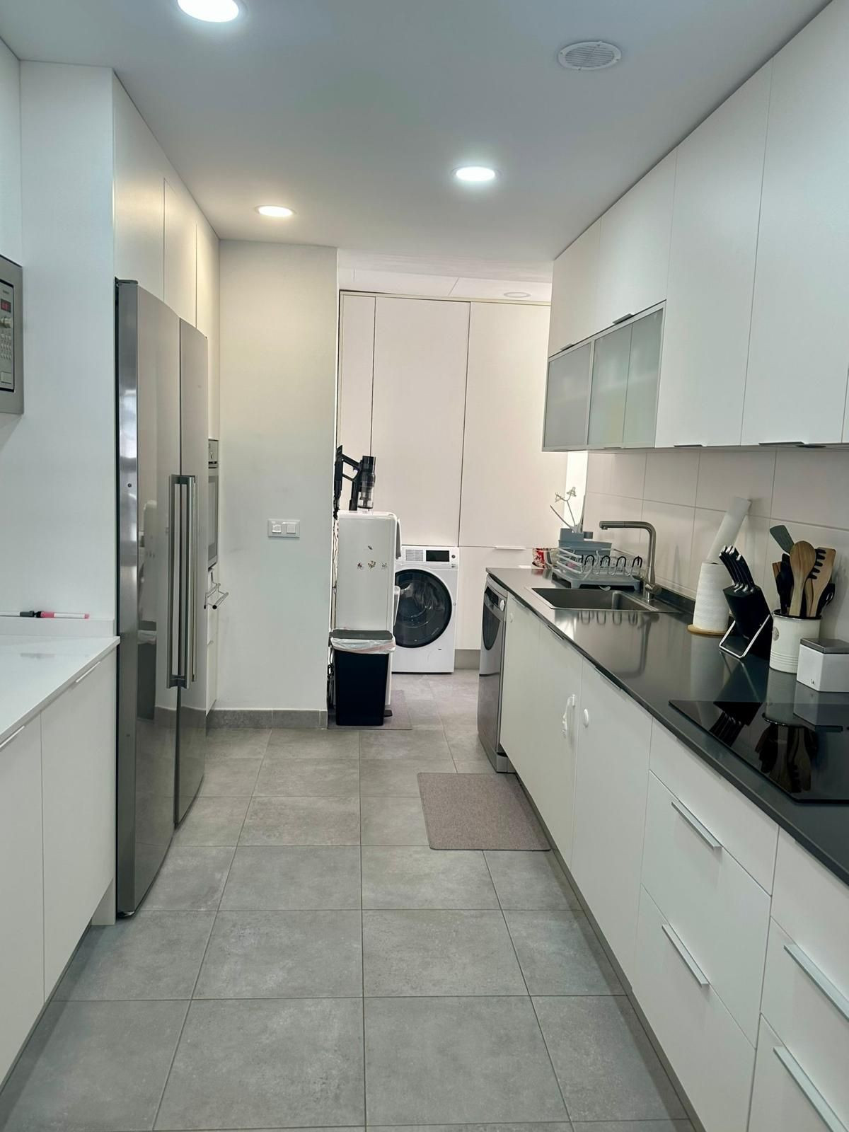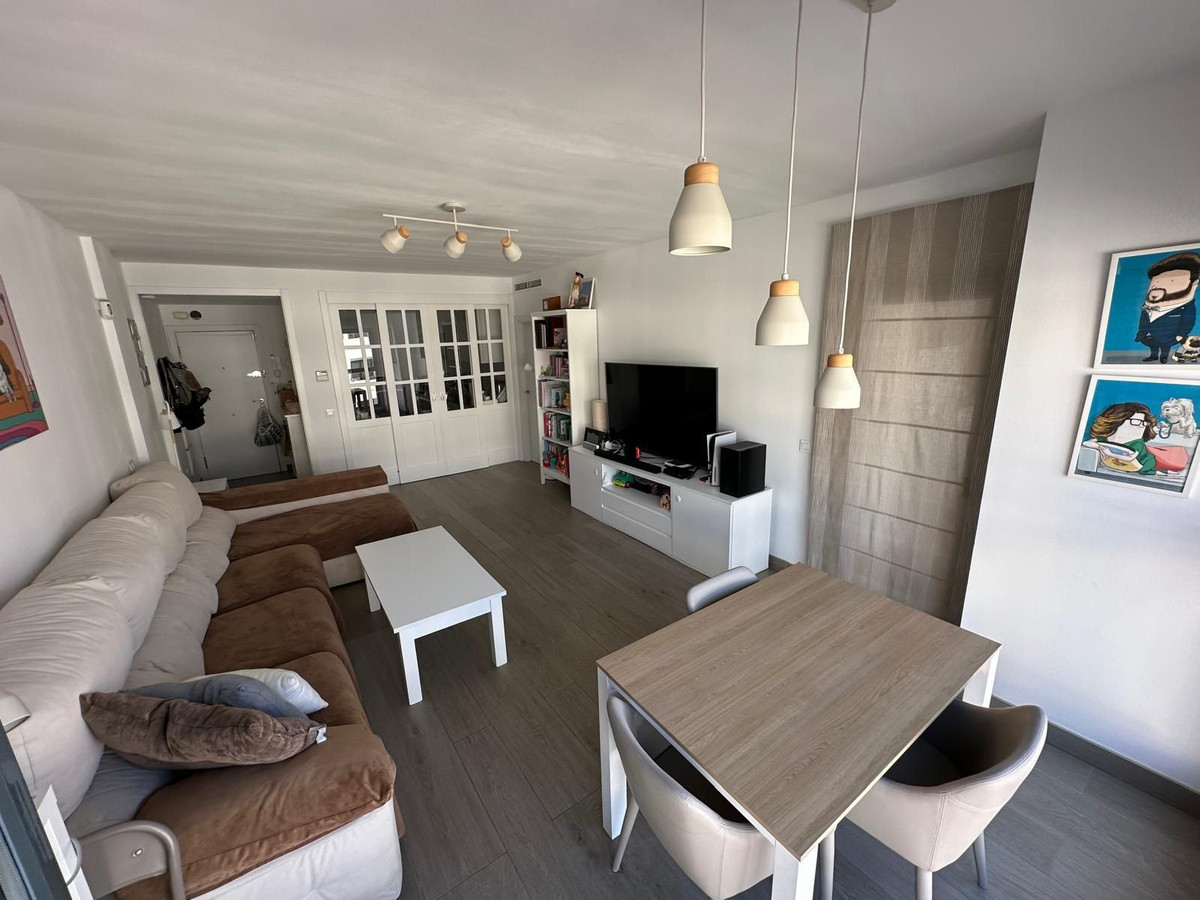 La cuisine est indépendante, mais dotée de portes coulissantes sur mesure s'ouvrant vers l'extérieur, permettant de la connecter au salon-salle à manger selon les besoins, sans occuper d'espace et créant une impression d'ouverture et de fluidité. L'appartement comprend trois chambres avec placards intégrés, dont la principale avec salle de bains attenante, ainsi qu'une seconde salle de bains complète.