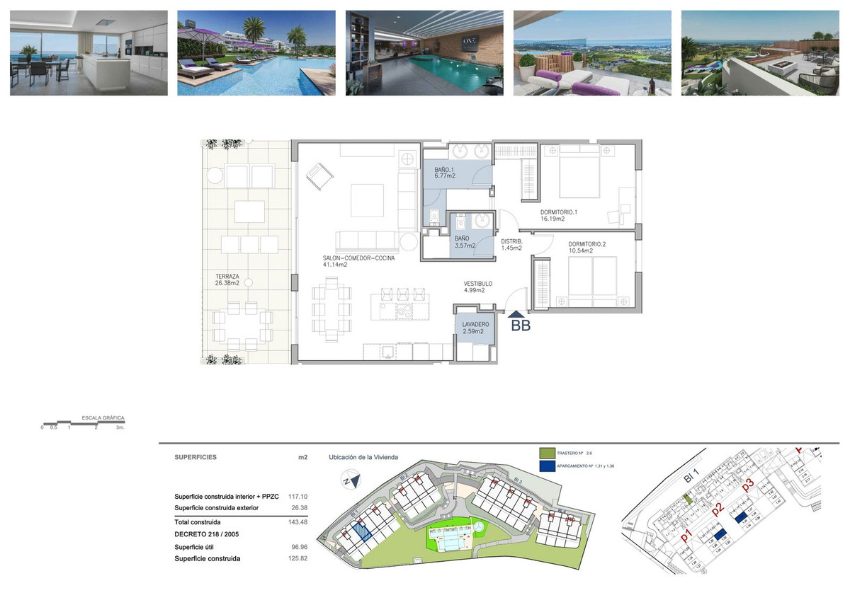 Le prix de l'appartement comprend deux places de parking, un atout précieux sur la Costa del Sol. Un espace de rangement supplémentaire permet de ranger facilement les articles saisonniers, le matériel de sport ou les bagages. La surface totale construite dépasse 143 mètres carrés, ce qui rend cet appartement très spacieux par rapport à sa surface habitable.