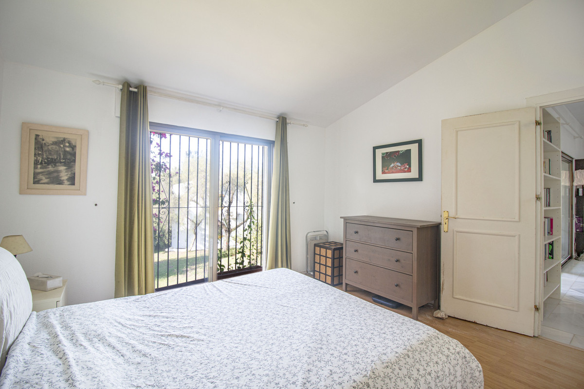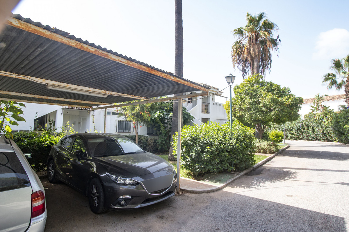 Depuis le salon, des portes coulissantes mènent à une terrasse couverte avec rideaux de verre, offrant un espace extérieur polyvalent idéal pour se détendre ou recevoir en toute saison. La terrasse offre une vue sur les jardins communs impeccablement entretenus, entourés d'une végétation luxuriante et d'une grande piscine, qui vous invitent à profiter pleinement de l'art de vivre de la Costa del Sol.