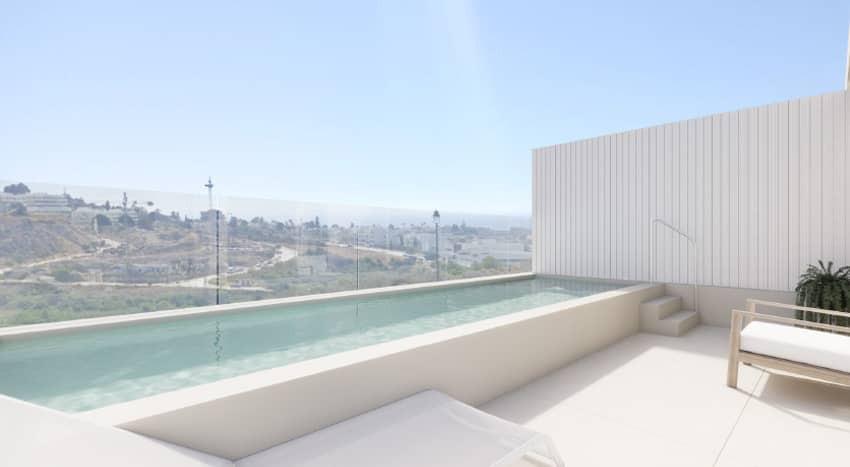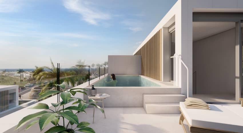 The developer chose a plot with beautiful views of the sea, golf course, and mountains and consists of only 10 semi-detached villas with 4 bedrooms, 3 or 4 bathrooms, 1 or 2 toilets, and an office that can be used as a laundry room. The corner villas have their own gardens and private saltwater pools. The central villas have a rooftop pool. The open, functional spaces are undoubtedly the focal points of the homes, connecting us to the terraces and their beautiful views of the sea, golf course, and mountains.