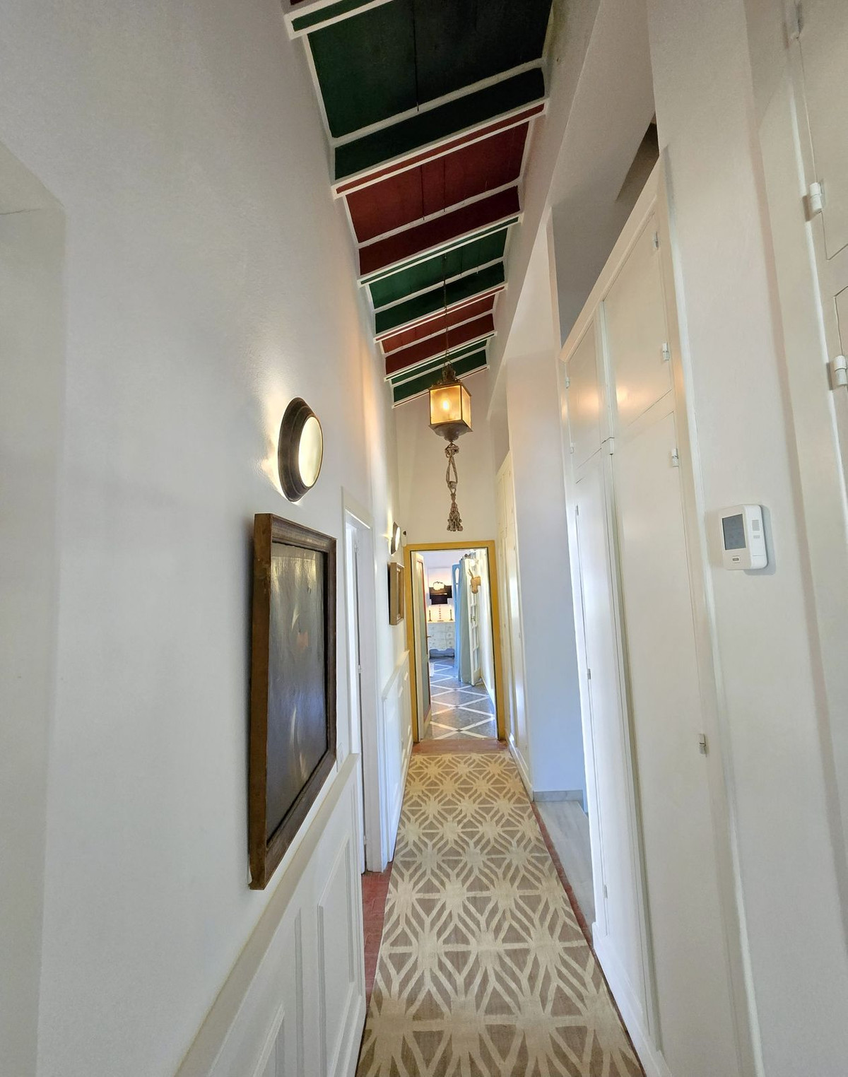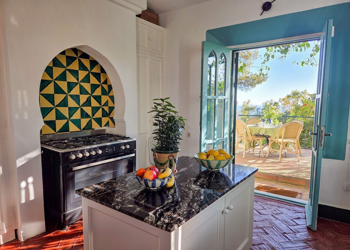 Inside, a welcoming hallway with pitched wooden ceilings sets the tone for the home’s elegant interior. To the left, a bright and airy living room with a fireplace is bathed in light, creating a warm and inviting atmosphere. The kitchen, brimming with character and vibrant colors, opens onto a dramatic suspended terrace offering breathtaking sea views, beautifully framed by bougainvillea and jacaranda trees — a perfect spot to savor alfresco meals or simply soak in the Mediterranean atmosphere.