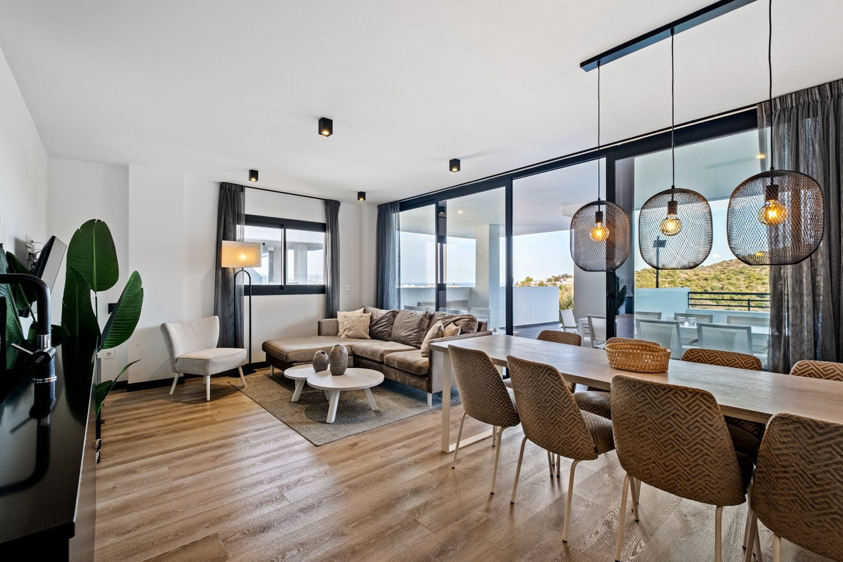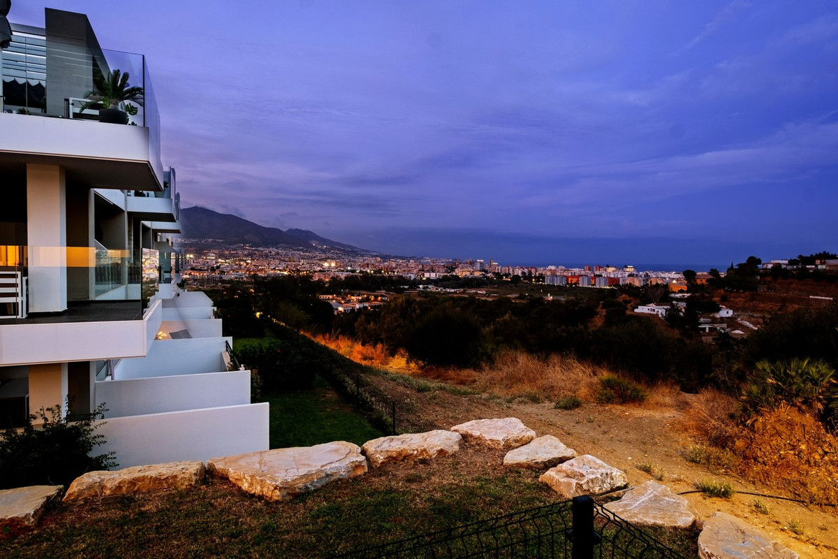 Featuring 4 spacious bedrooms and 2 full bathrooms, the open-plan kitchen flows seamlessly into the living area, creating a bright and contemporary space. Unlike other apartments in the complex, this home boasts a lawn garden, a rear terrace, a side terrace, and a front terrace—ensuring constant sunshine, maximum privacy, and spectacular views of the ocean, the nearby nature reserve, and the Mijas hills.
