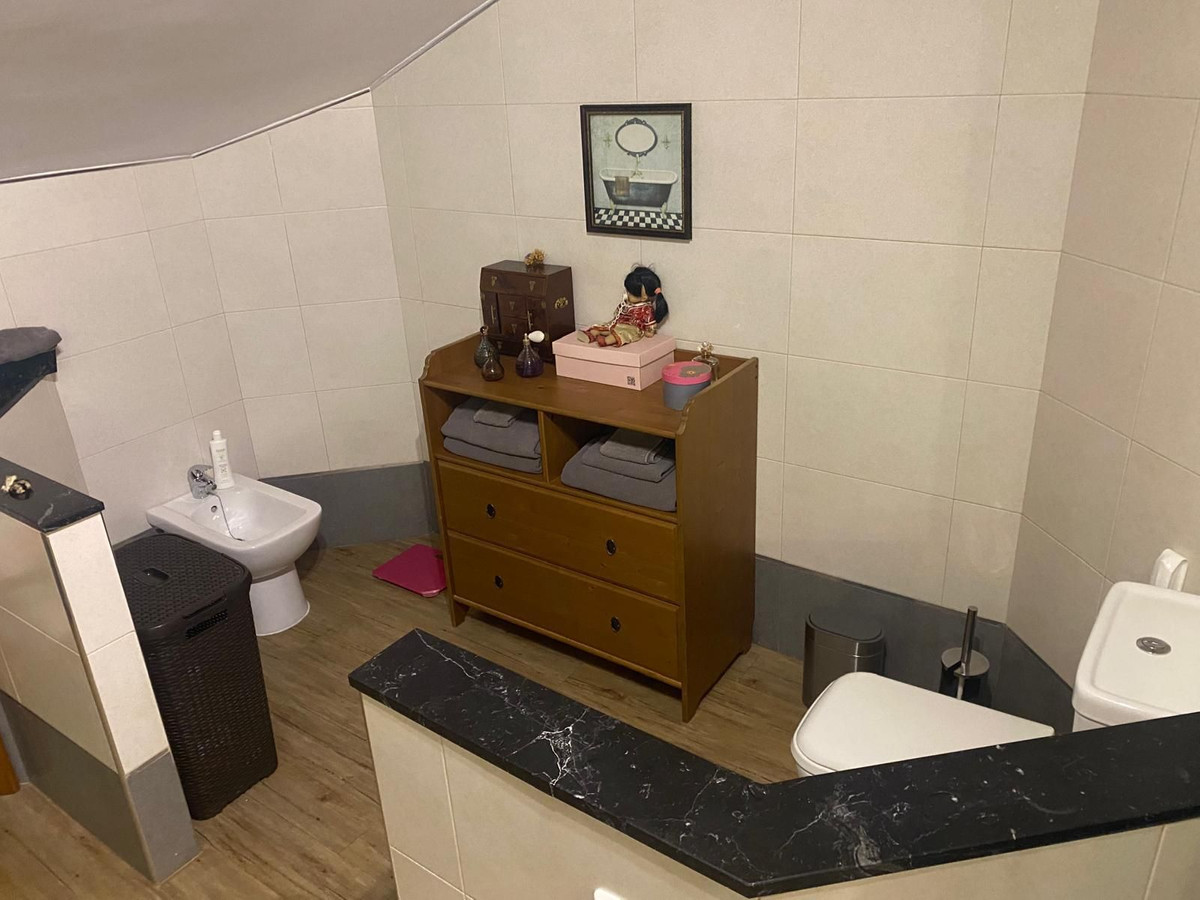 Distributed over two floors, the ground floor houses the living room, kitchen, patio, laundry room, and a toilet, and the upper floor has 4 attic bedrooms and 2 bathrooms.