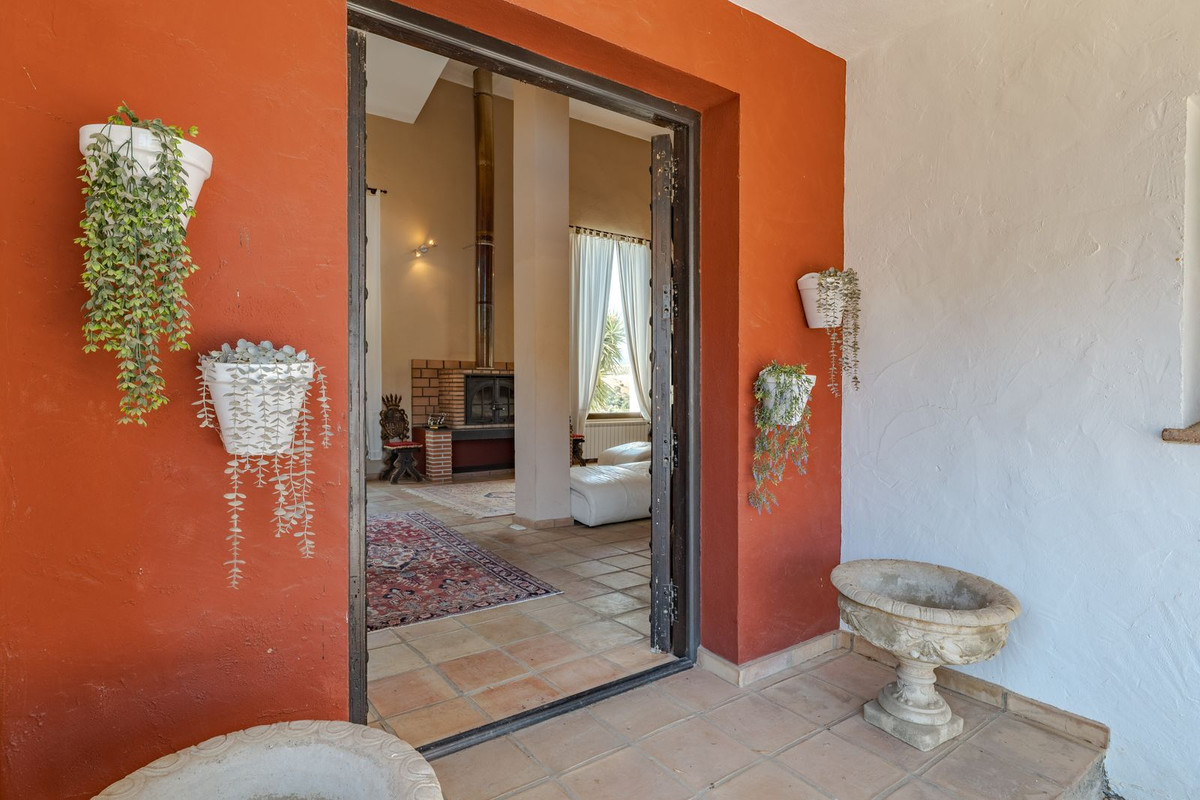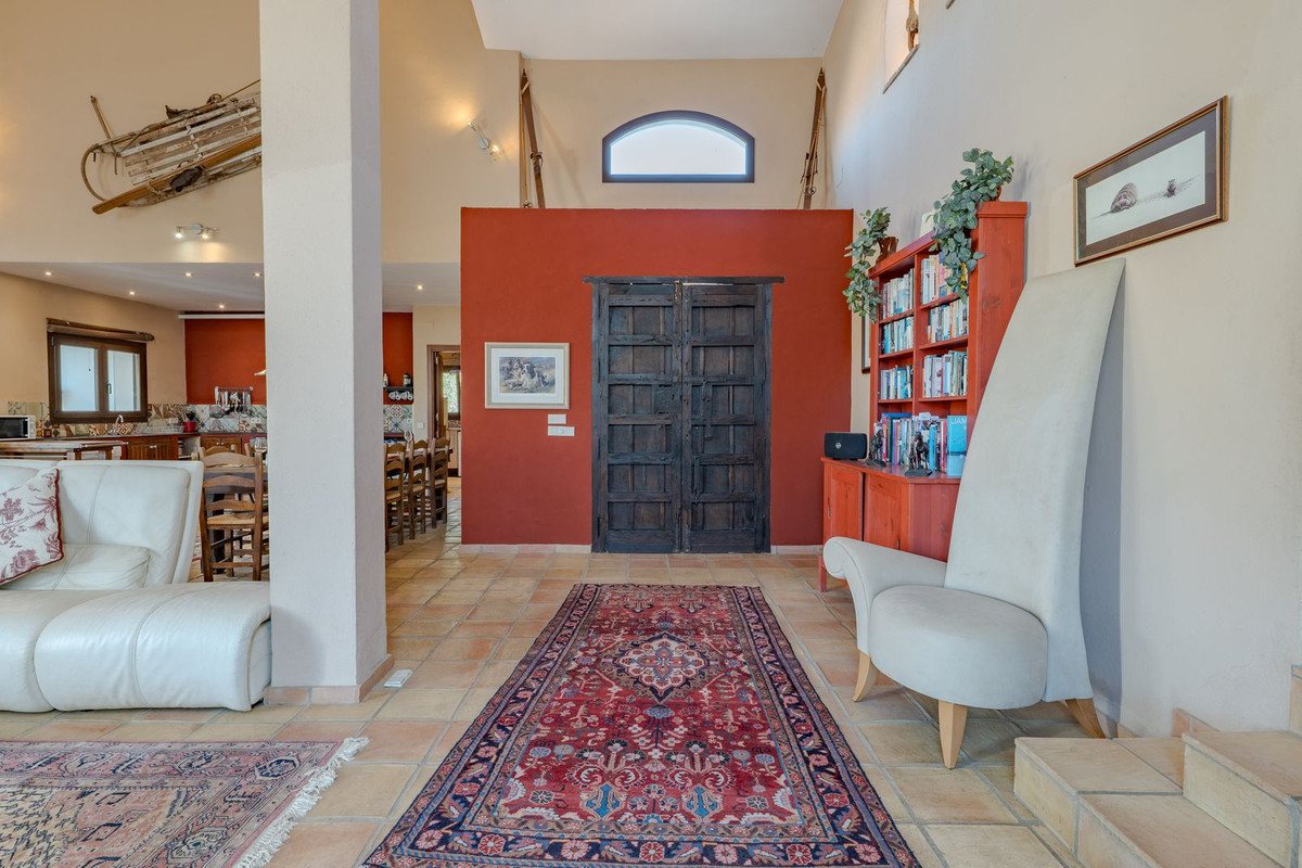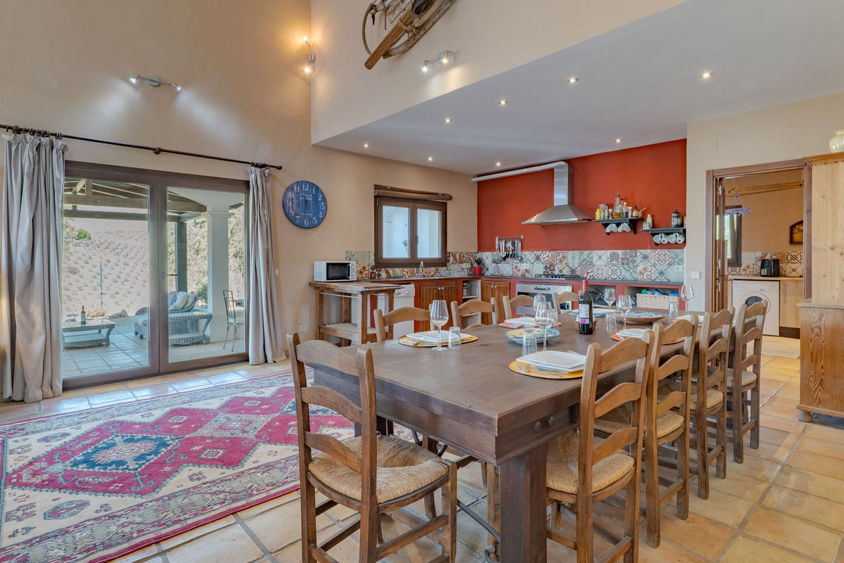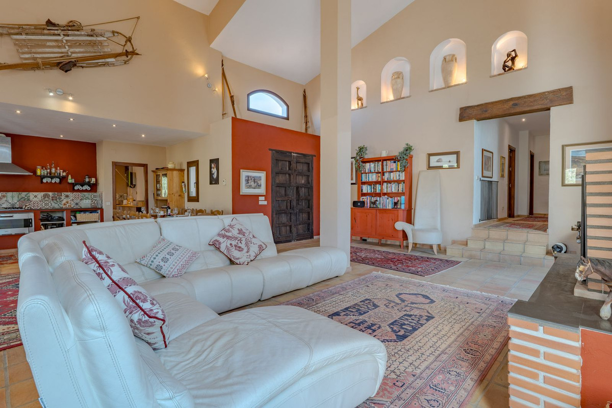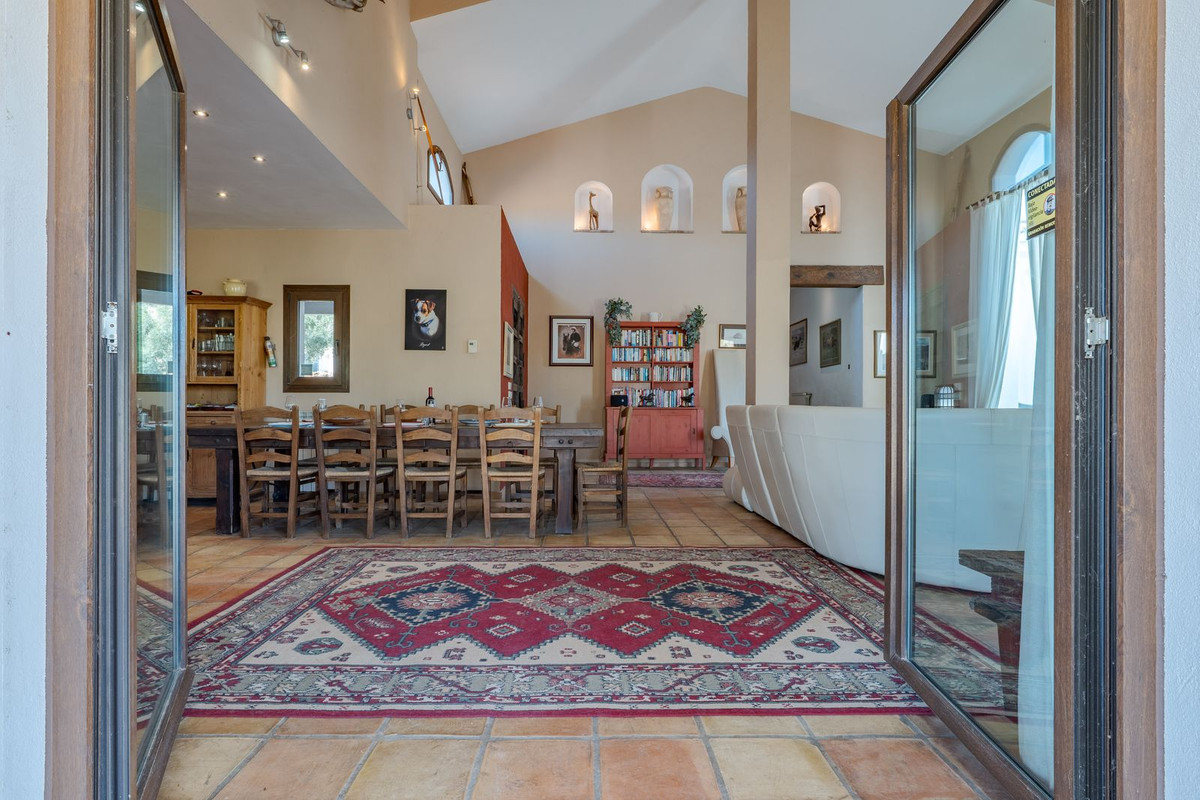 Hauts plafonds et grandes fenêtres : ces éléments architecturaux offrent un maximum de lumière naturelle tout au long de la journée et accentuent la sensation d'espace. Profitez de la chaleur de la cheminée lors des soirées plus fraîches, entourée de charmants sols en terre cuite et de la belle porte d'entrée en bois espagnol qui souligne l'atmosphère champêtre.