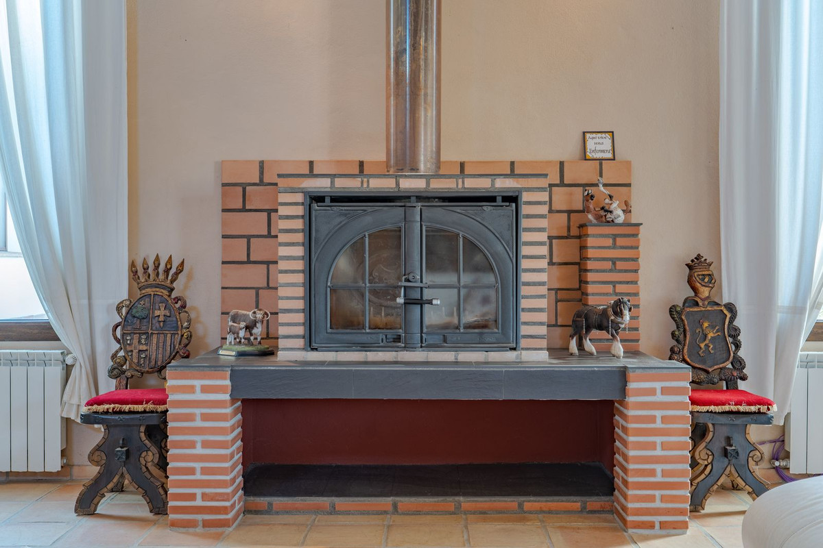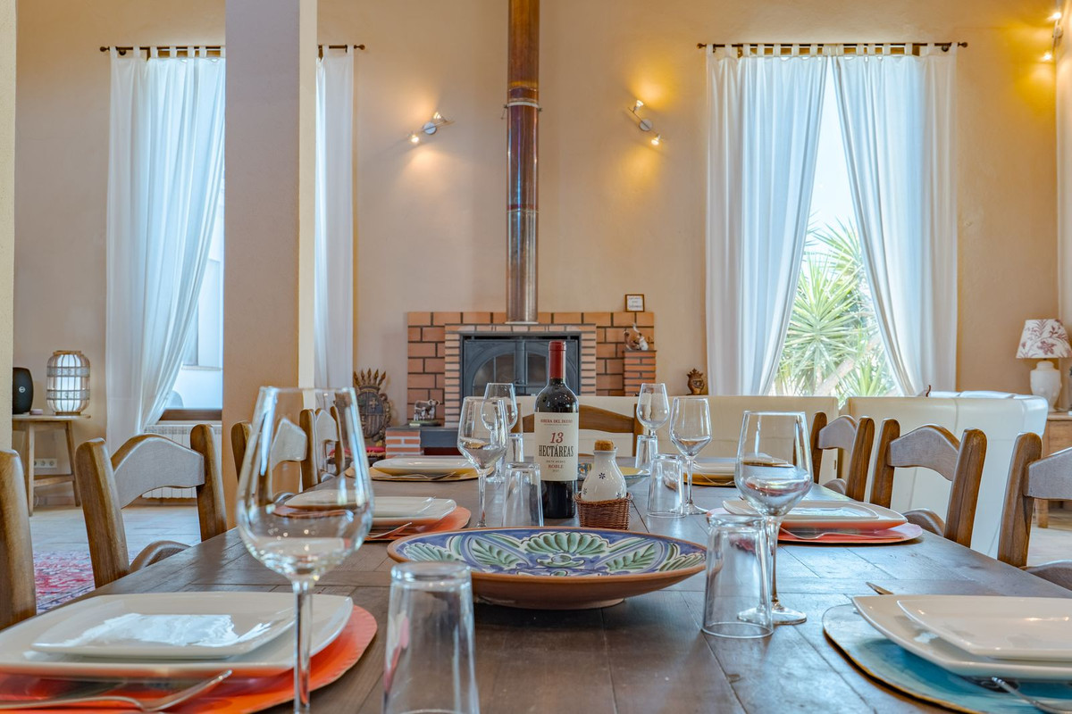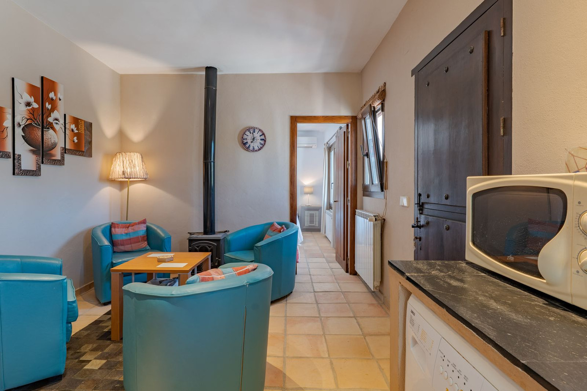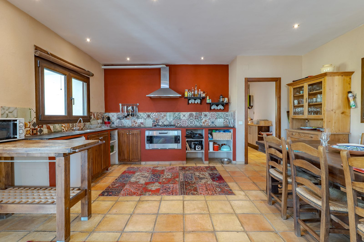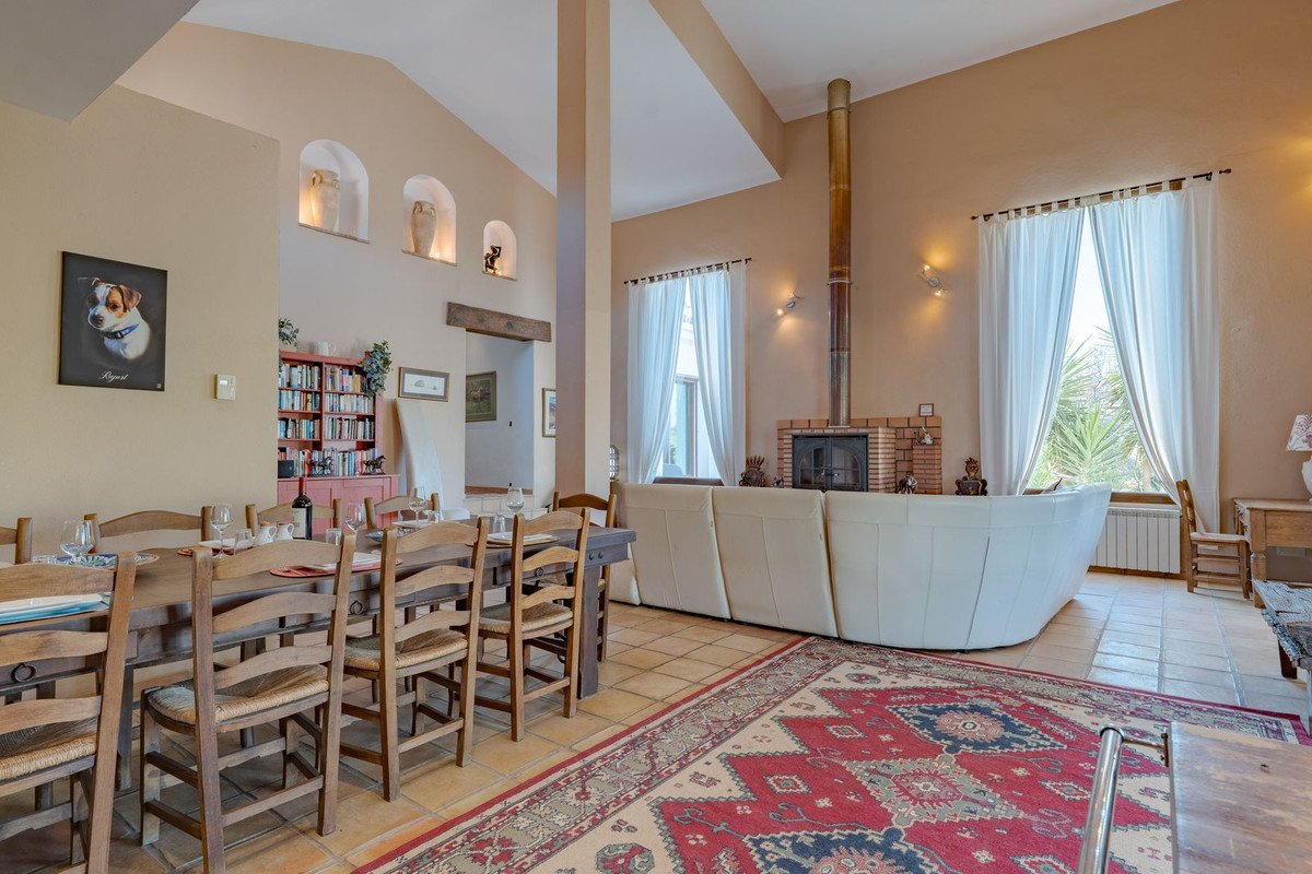 Hauts plafonds et grandes fenêtres : ces éléments architecturaux offrent un maximum de lumière naturelle tout au long de la journée et accentuent la sensation d'espace. Profitez de la chaleur de la cheminée lors des soirées plus fraîches, entourée de charmants sols en terre cuite et de la belle porte d'entrée en bois espagnol qui souligne l'atmosphère champêtre.