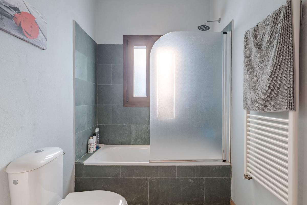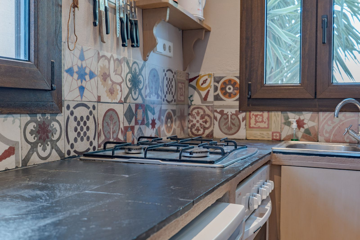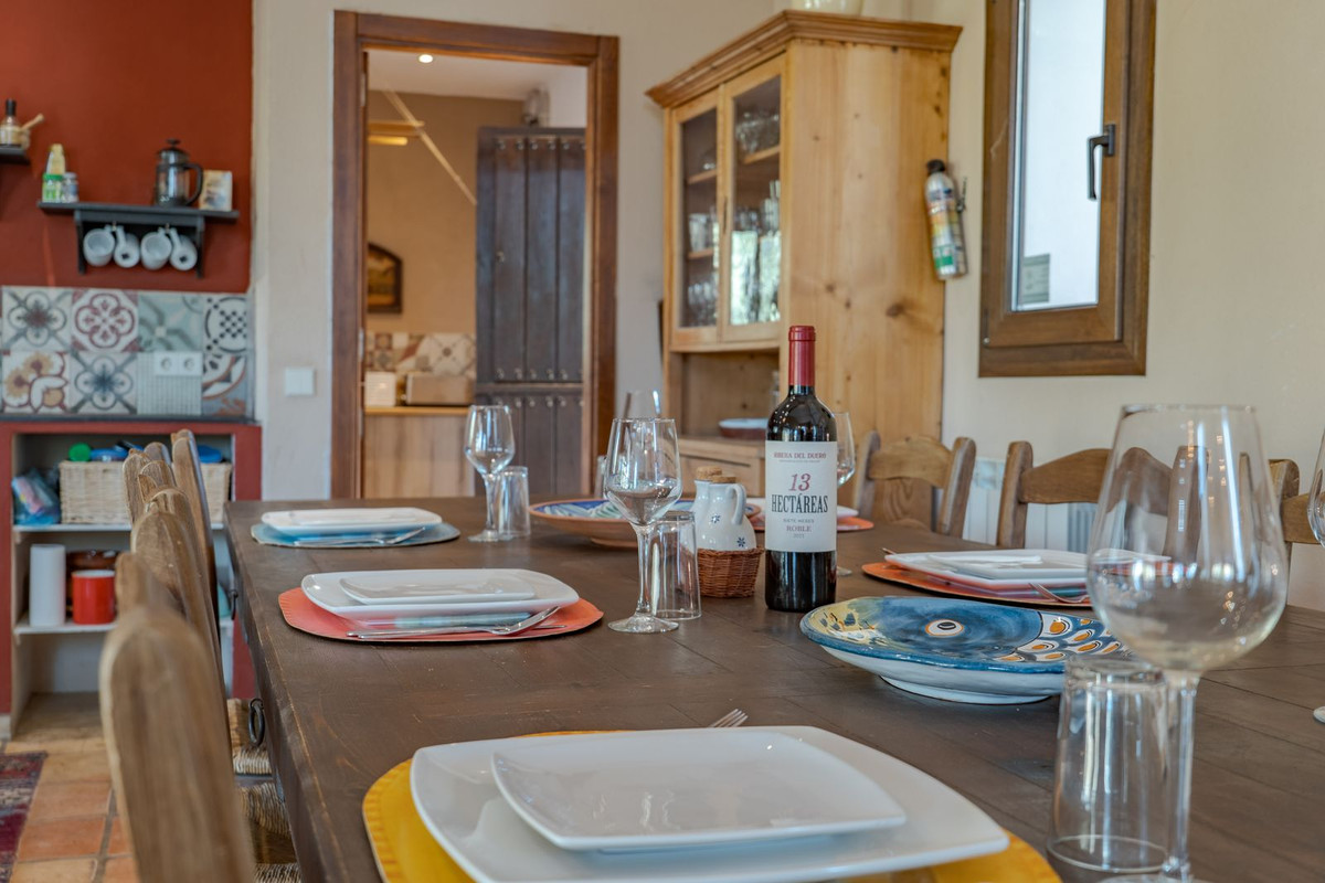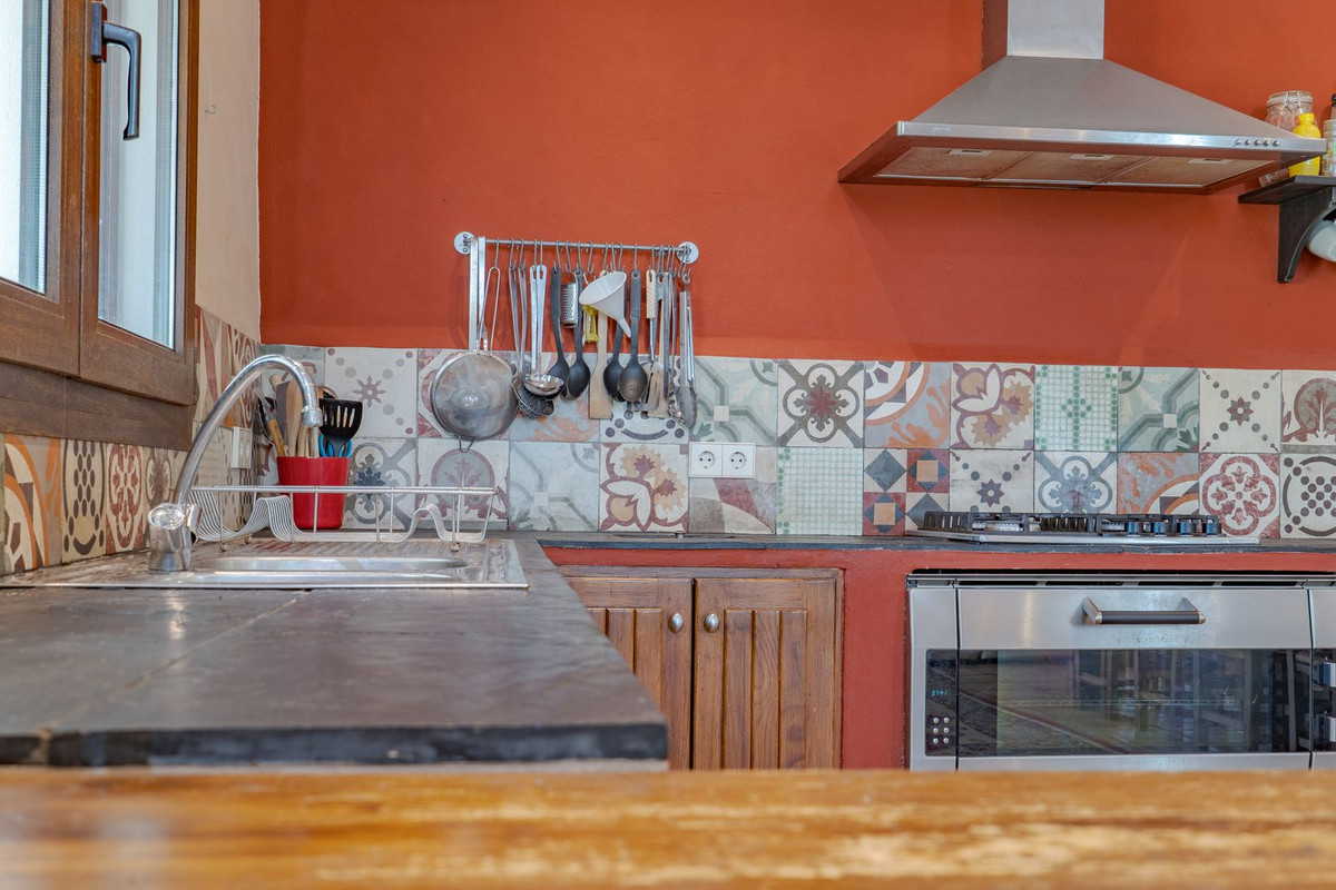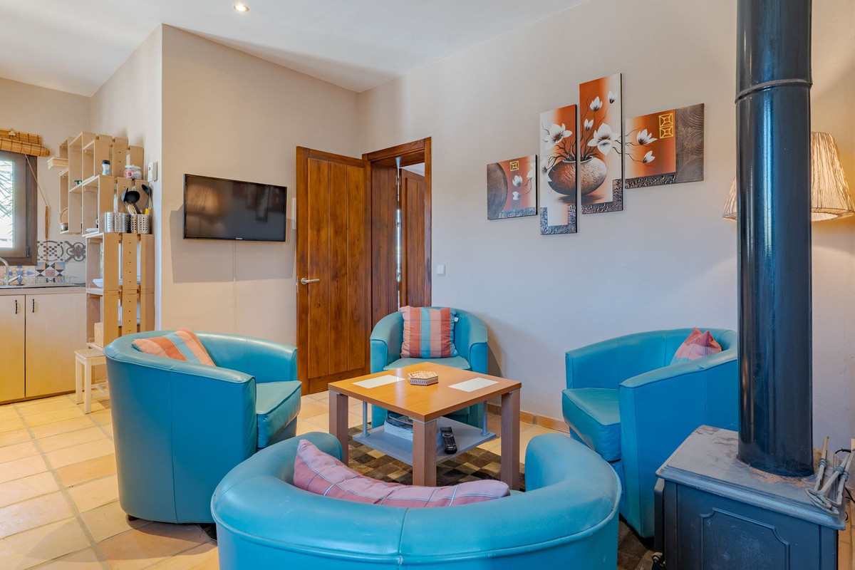 Hauts plafonds et grandes fenêtres : ces éléments architecturaux offrent un maximum de lumière naturelle tout au long de la journée et accentuent la sensation d'espace. Profitez de la chaleur de la cheminée lors des soirées plus fraîches, entourée de charmants sols en terre cuite et de la belle porte d'entrée en bois espagnol qui souligne l'atmosphère champêtre.