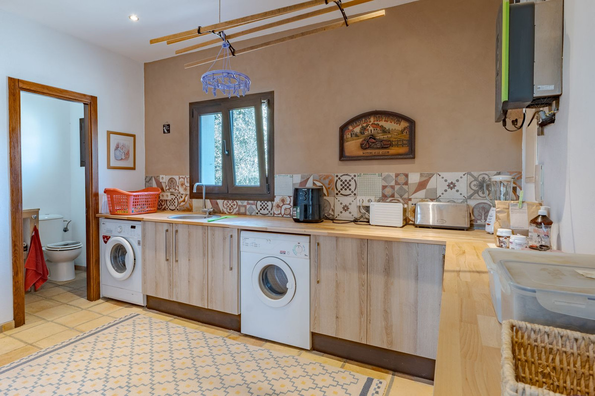 La cuisine entièrement équipée s'intègre harmonieusement au séjour, idéal pour les moments conviviaux et les réceptions. Derrière la cuisine se trouvent une grande cuisine/buanderie et des toilettes invités.