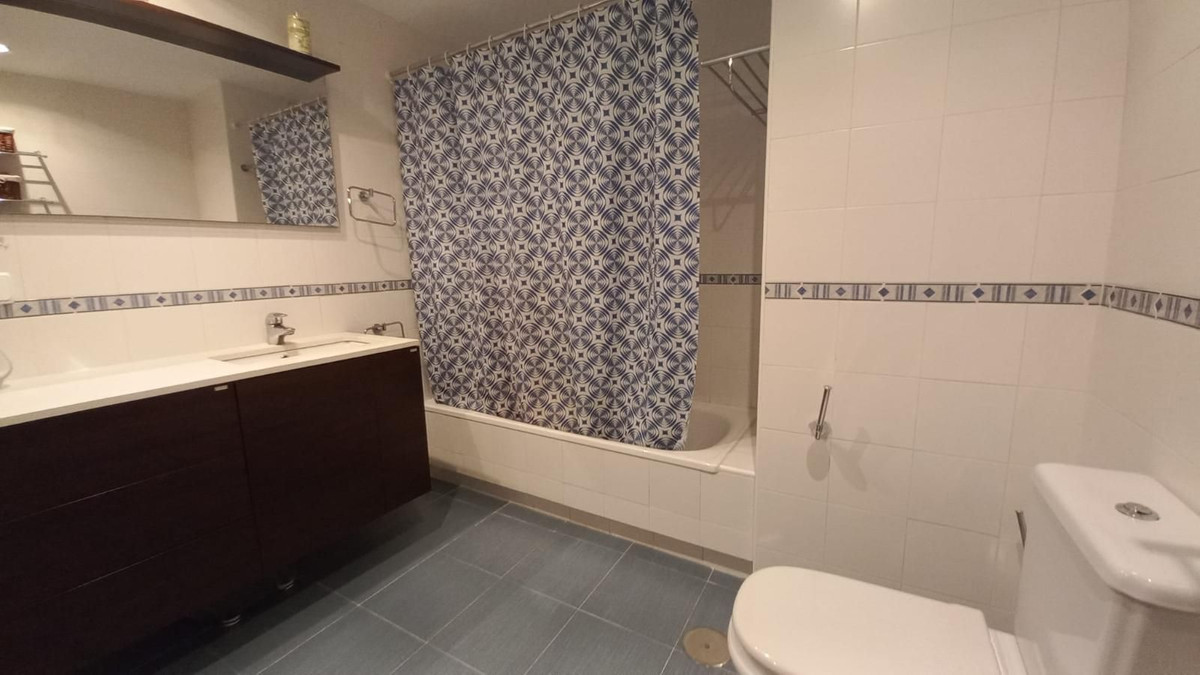 The apartment includes centralized air conditioning in the bedrooms and living area, a fully equipped independent kitchen, and a spacious living-dining room with access to the main terrace — also enclosed with glass curtains, ideal for year-round enjoyment.