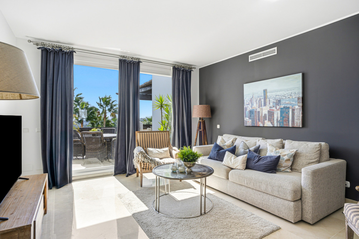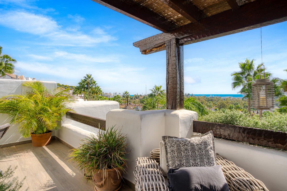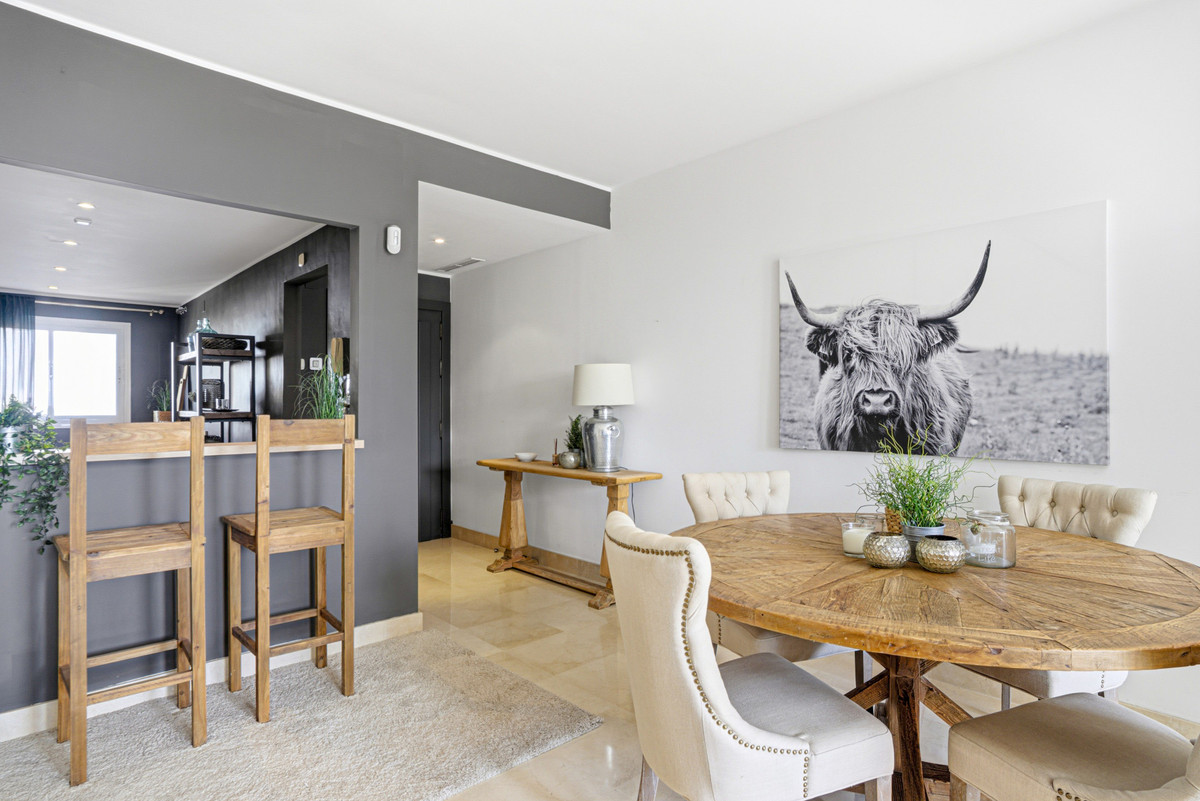 Wonderful two-bedroom, first floor apartment located in the sought-after gated community of Las Tortugas, Nueva Andalucía. Recently renovated and beautifully decorated, this property offers a perfect combination of Andalusian charm and modern comfort. The community boasts a large communal swimming pool surrounded by landscaped gardens with stunning sea views. Located in a tranquil and private setting in the heart of Nueva Andalucía, it is just a short drive to shops, restaurants, international schools, and Puerto Banús. The complex is also surrounded by several renowned golf courses, making it ideal for golf enthusiasts. The property has an open plan living and dining area with access to a spacious south-facing terrace; fully fitted kitchen; master suite with terrace access; guest bedroom; and guest bathroom. Other features include hot and cold air conditioning, marble floors, fitted wardrobes, a private parking space, and a storeroom.