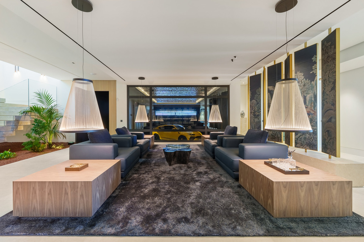 The lower floor is a true haven of leisure and well-being, spanning nearly 800 m². It includes several lounges for relaxation and entertainment, a playroom, a state-of-the-art cinema, a gym, and an indoor spa area with a heated pool and jacuzzi. Additional features include a private home office, a garage for up to eight cars, and three more en-suite bedrooms—one with an independent entrance and kitchenette, ideal for guests or staff accommodation.
