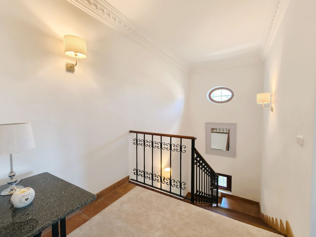 The villa features a spacious living room with a cozy fireplace, which opens onto a terrace that has been enclosed with large windows, offering beautiful views over the golf course and creating a bright, inviting space for year-round enjoyment. The family-size kitchen provides direct access to the pool area, ensuring a seamless flow for entertaining. A picturesque patio with a fountain adds a touch of Andalusian character.