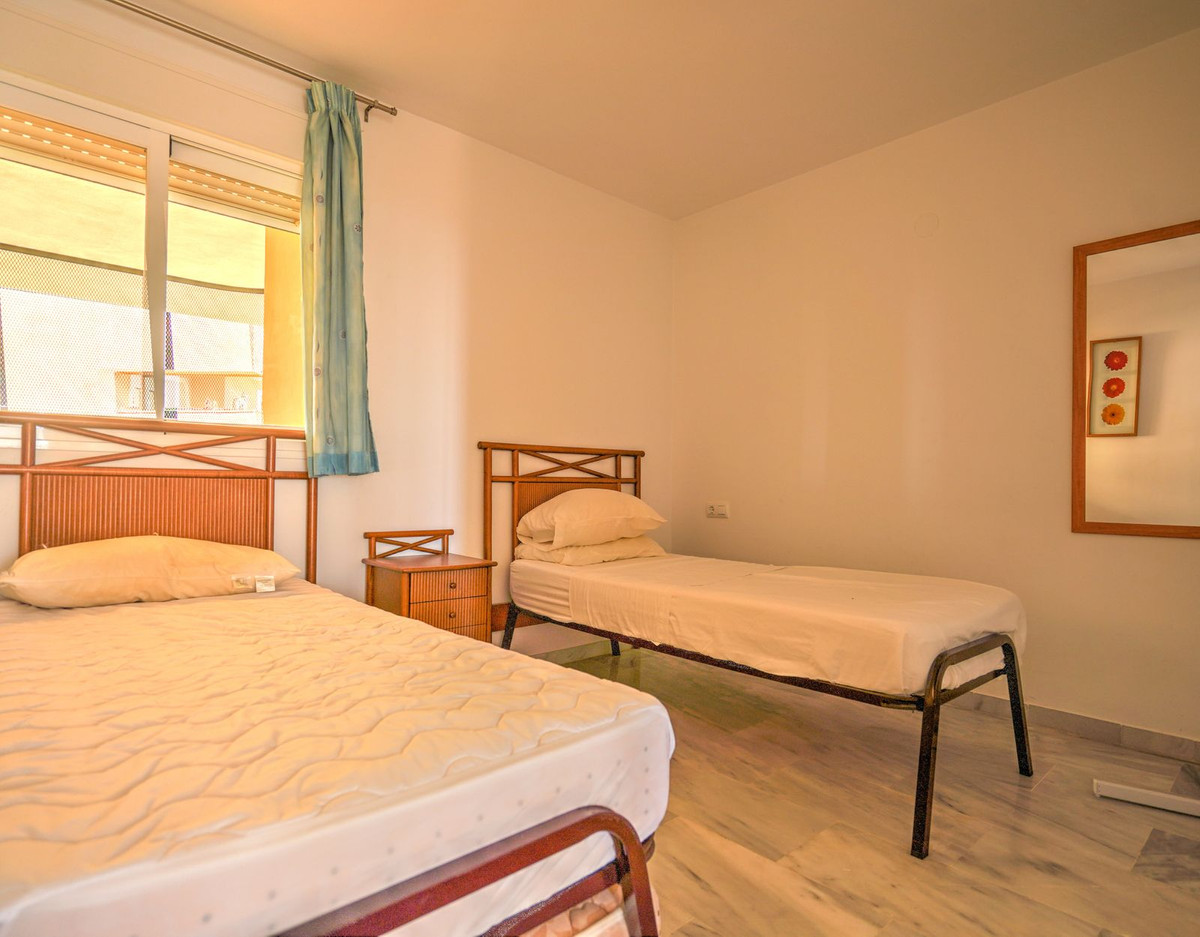 Inside, the apartment features a wide entrance hall leading to a large lounge with a fireplace. The independent kitchen comes with a utility room, while the property offers two well-sized bedrooms and two full bathrooms. The master bedroom includes an en-suite. Additional features include marble floors, double glazing, and air conditioning.