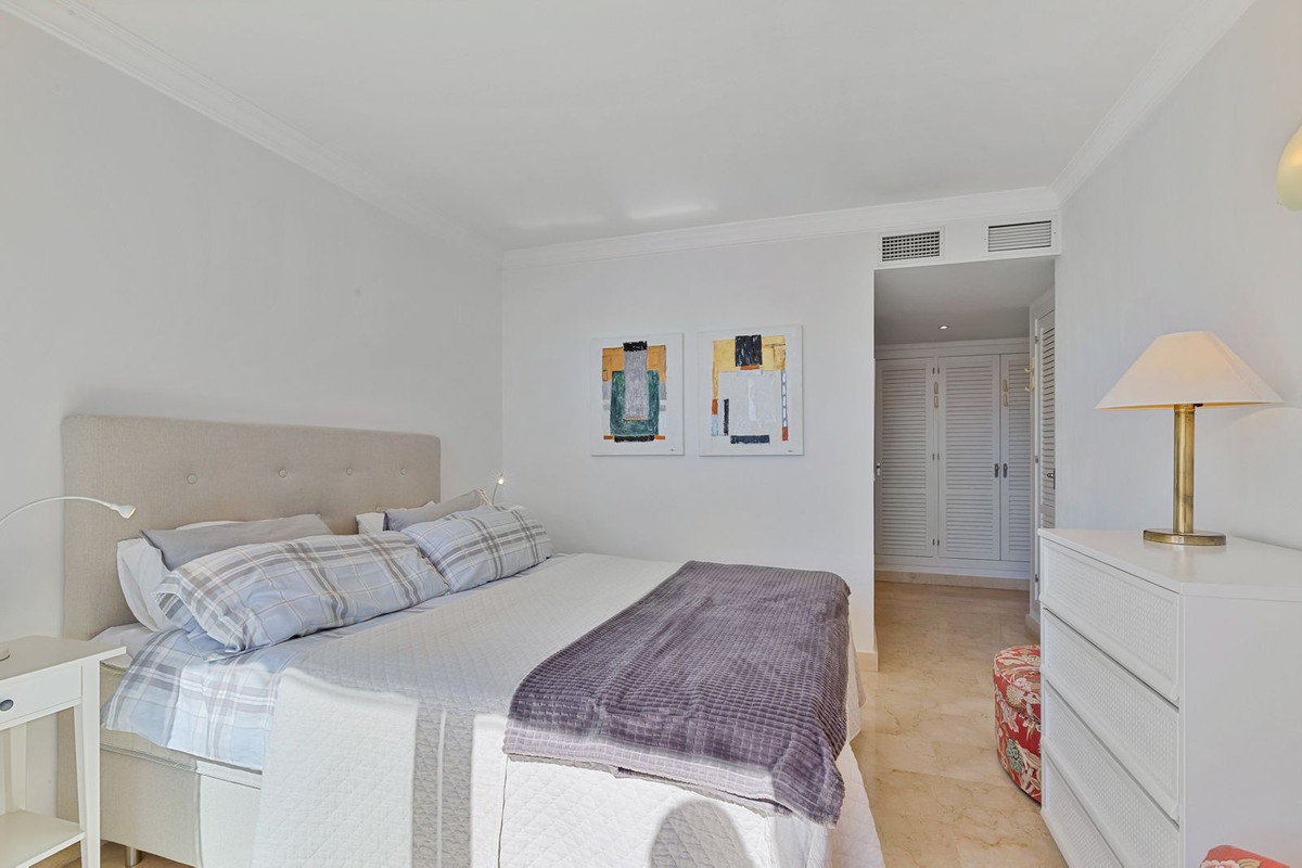 From the moment you step into the hall you are struck by the fantastic view and the natural light in the apartment. To the right there is a fully equipped kitchen with dining area and large windows overlooking the communal garden and one of the communal swimming pools. To the left there is the living room with fireplace and glass doors out onto the 22 m2 terrace with built-in sofa and space for a dining table, barbecue and plants. And did we mention that the terrace offers a fantastic view down to the sea and Fuengirola?!