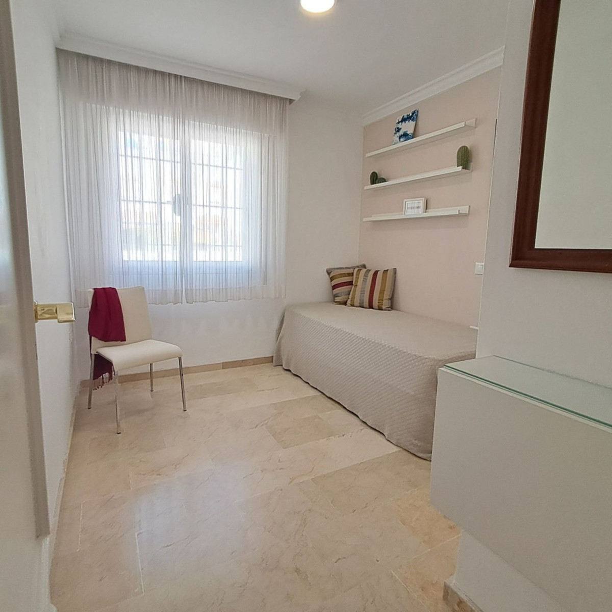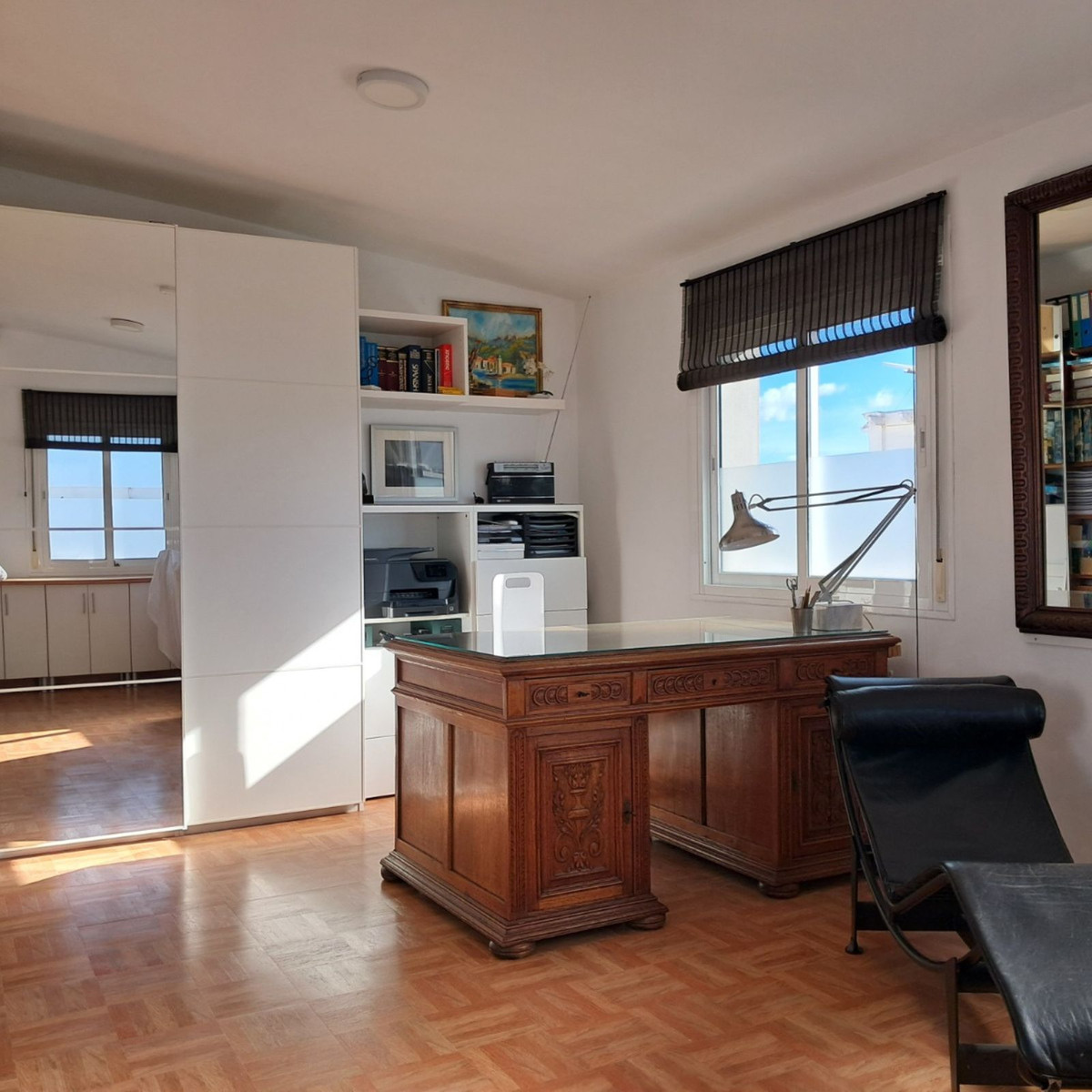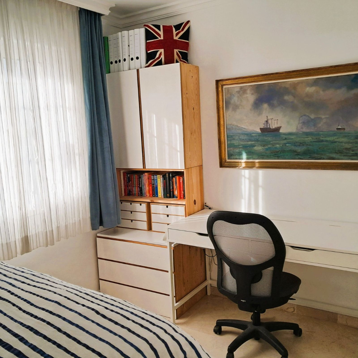 On the first floor are three bedrooms and two bathrooms. The master bedroom includes an en-suite bathroom, while the family bathroom has been fully renovated with premium materials. The second floor hosts a spacious fourth bedroom — currently used as a study — which opens directly onto an 18 m² rooftop terrace, fully refurbished in 2022, offering partial sea views and even a glimpse of Gibraltar.