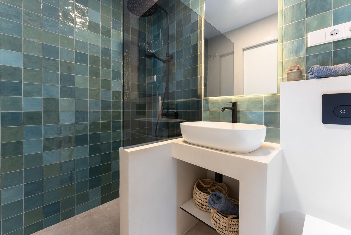 The second bedroom and its bathroom are located one floor below and offer total privacy, electric blinds, and plenty of storage space.