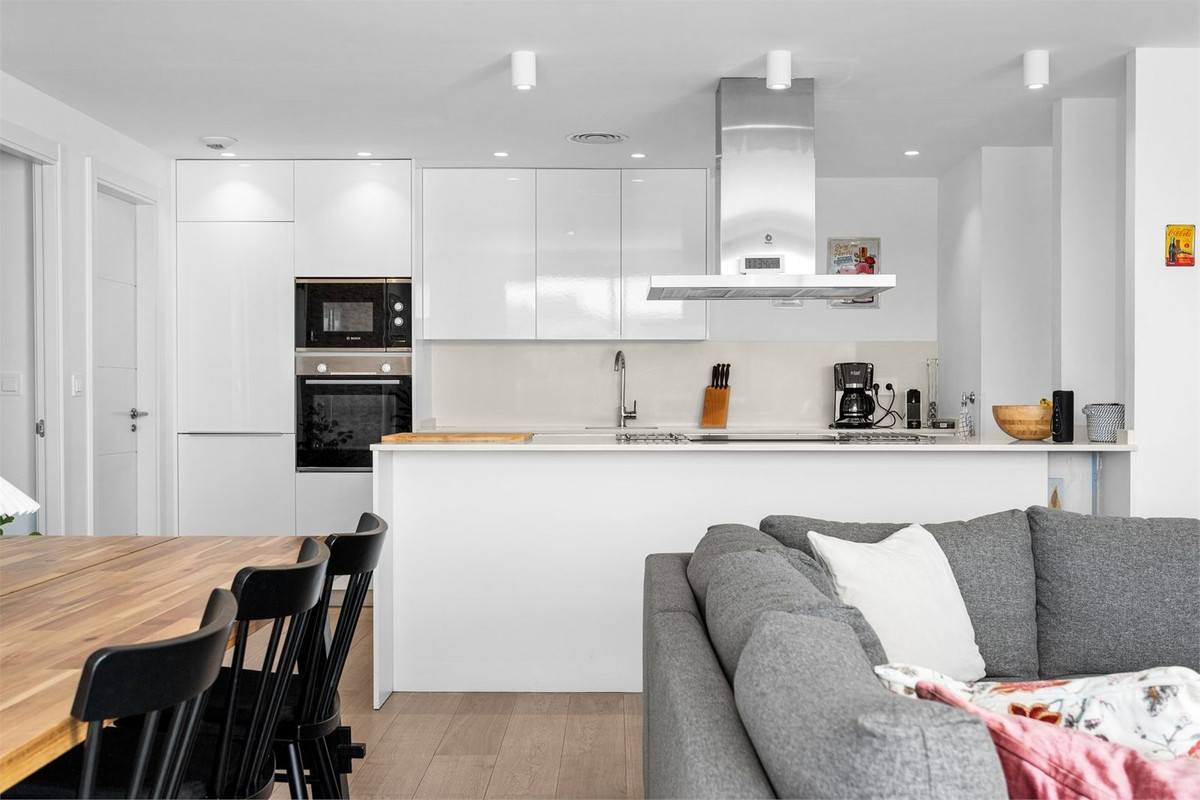 Le séjour, ouvert et accueillant, communique directement avec la grande cuisine équipée d'électroménagers BOSCH haut de gamme. Attenante à la cuisine se trouve une buanderie pratique avec lave-linge et système de chauffage. La surface habitable totale est de 138 m², dont 103 m² de surface utile.