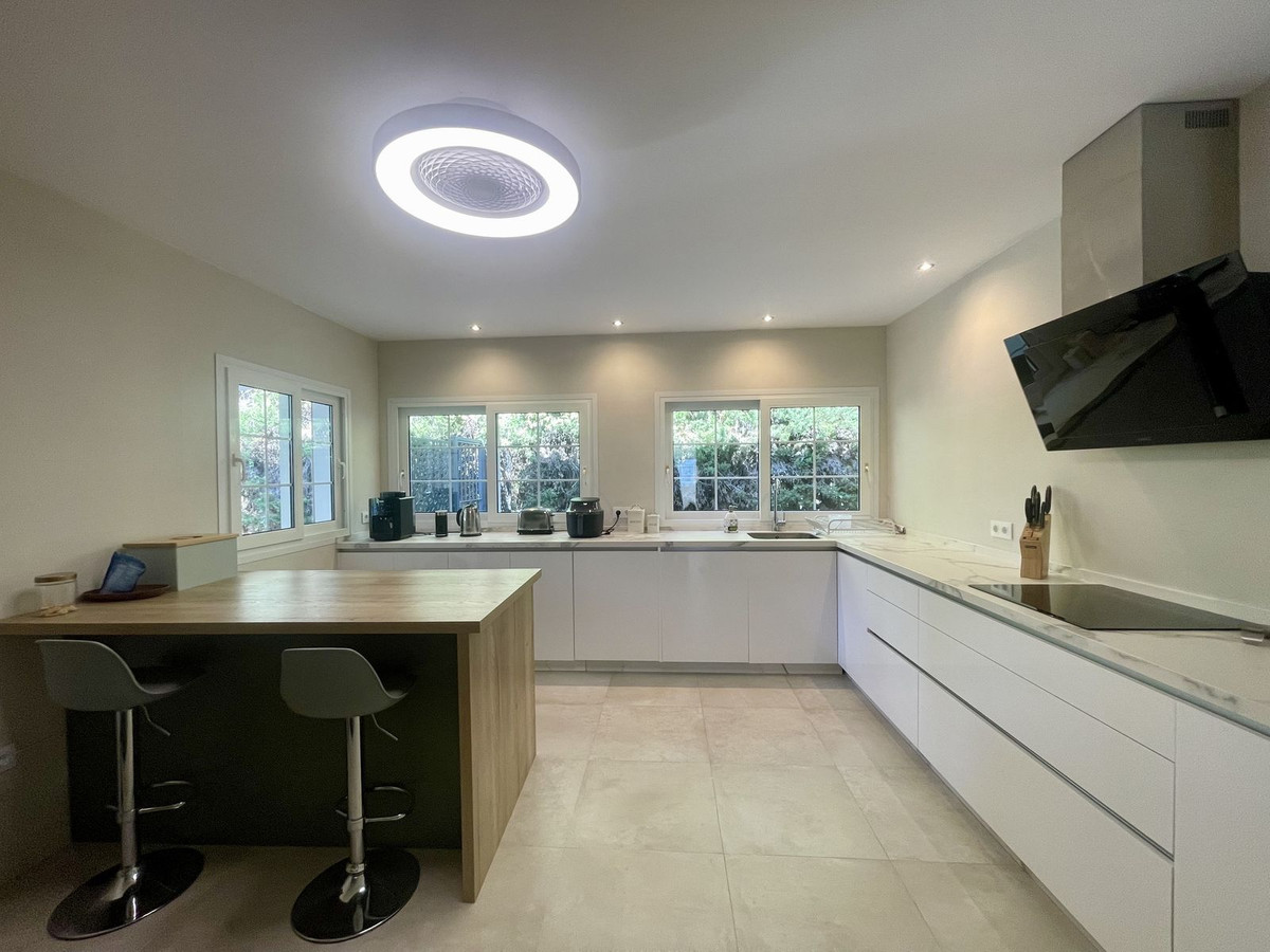 La maison comprend trois chambres et deux salles de bains, dont une suite parentale particulièrement spacieuse avec salle de bains privative, tandis que les deux autres chambres se partagent une salle de bains familiale. Le vaste séjour/salle à manger, baigné de lumière naturelle, offre un espace central convivial idéal pour se détendre ou recevoir. La cuisine est entièrement équipée d'appareils électroménagers de qualité, dont une cave à vin intégrée, et donne directement sur le jardin.