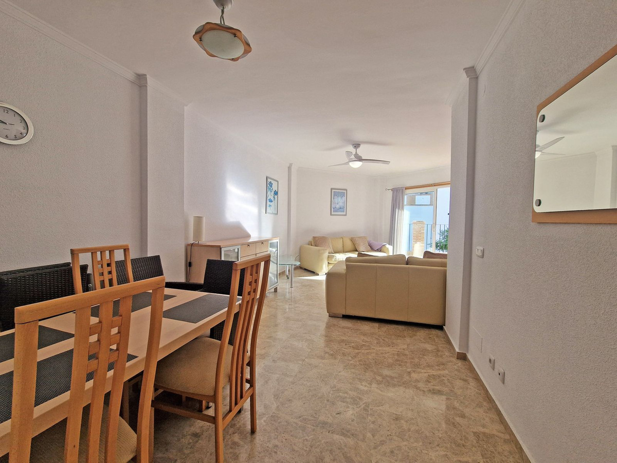 À l'intérieur, l'appartement se distingue par son élégant sol en marbre crème et sa grande cuisine semi-ouverte entièrement équipée. Il comprend deux chambres lumineuses et confortables, chacune dotée d'un placard intégré, et deux salles de bains, dont une attenante. La chambre principale et le salon donnent directement sur la terrasse, créant ainsi une belle continuité entre les espaces de vie intérieurs et extérieurs.