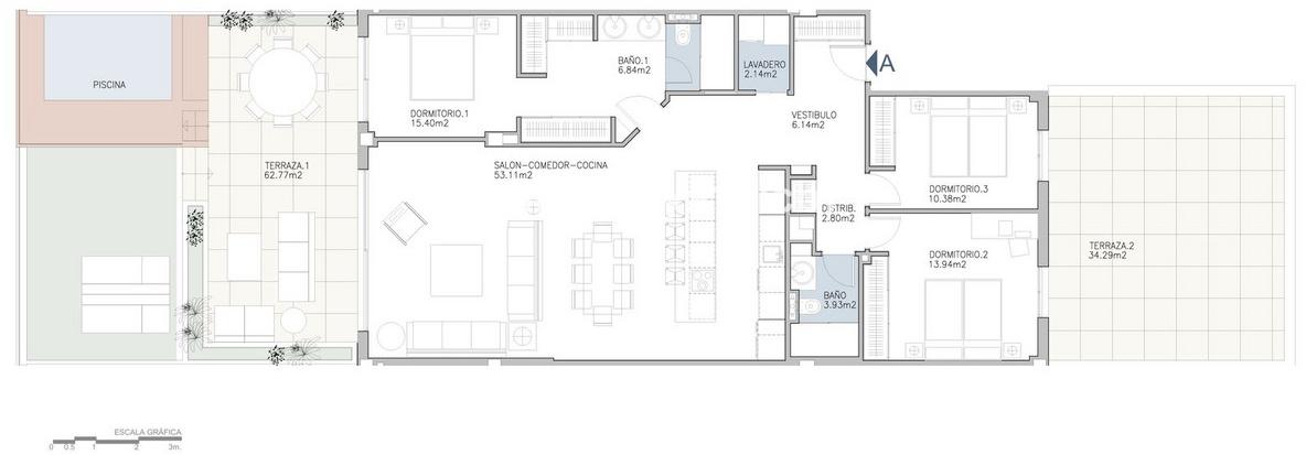 Cet appartement en rez-de-chaussée surélevé comprend trois chambres spacieuses, chacune dotée de placards intégrés, et deux salles de bains modernes. L'espace de vie ouvert bénéficie de finitions haut de gamme et inclut une cuisine NEFF entièrement équipée, ainsi qu'une buanderie séparée pouvant accueillir un lave-linge et un sèche-linge. Le confort est assuré toute l'année grâce à la climatisation avec réglage individuel de la température dans chaque pièce et au chauffage au sol dans tout l'appartement.