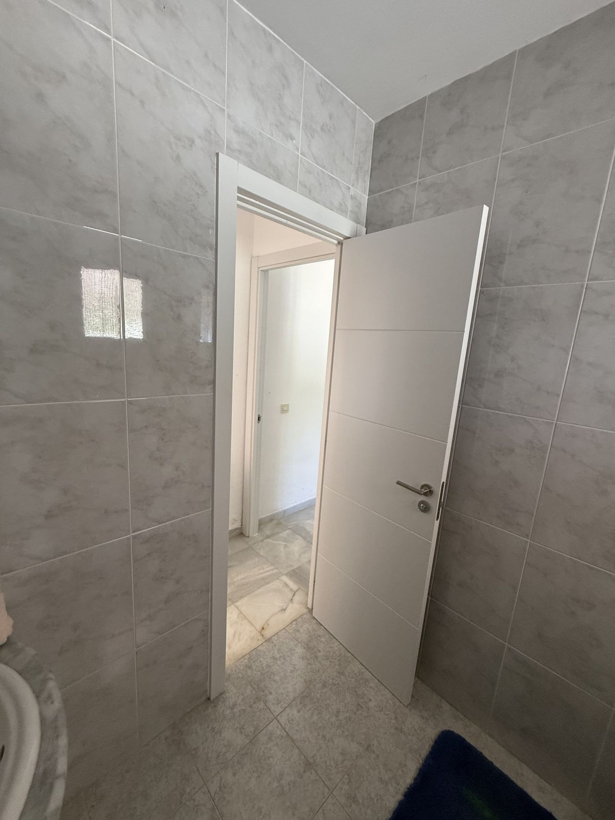 Au rez-de-chaussée, vous trouverez une cuisine ouverte sur le séjour et la salle à manger, donnant sur une terrasse couverte très privée, idéale pour les douces soirées d'été. Depuis la salle à manger, un couloir mène à la chambre d'amis et à sa salle de bains avec baignoire. La chambre d'amis est une chambre double spacieuse (actuellement aménagée avec deux lits simples) dotée de placards intégrés et de la climatisation.