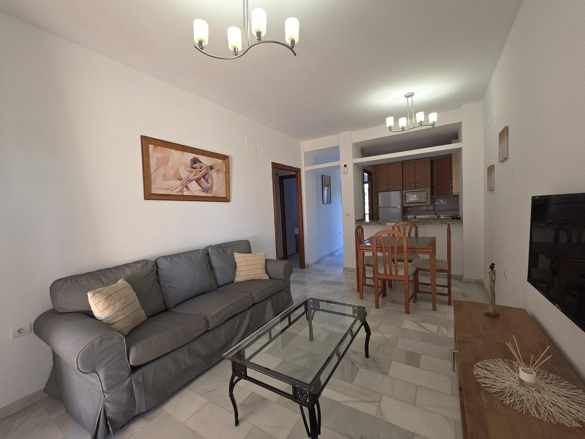 Le salon, spacieux et baigné de lumière naturelle, donne directement sur une terrasse idéale pour prendre le petit-déjeuner au soleil, se détendre avec un livre l'après-midi ou savourer des dîners d'été. La terrasse est un atout majeur de la propriété, permettant de profiter du charme du climat de la Costa del Sol quasiment toute l'année.