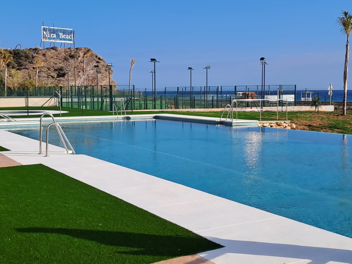 Les appartements du rez-de-chaussée disposent de grandes terrasses, tandis que ceux du premier et du deuxième étage offrent des terrasses privatives. Le complexe résidentiel comprend des jardins paysagers, deux piscines et deux courts de paddle-tennis.