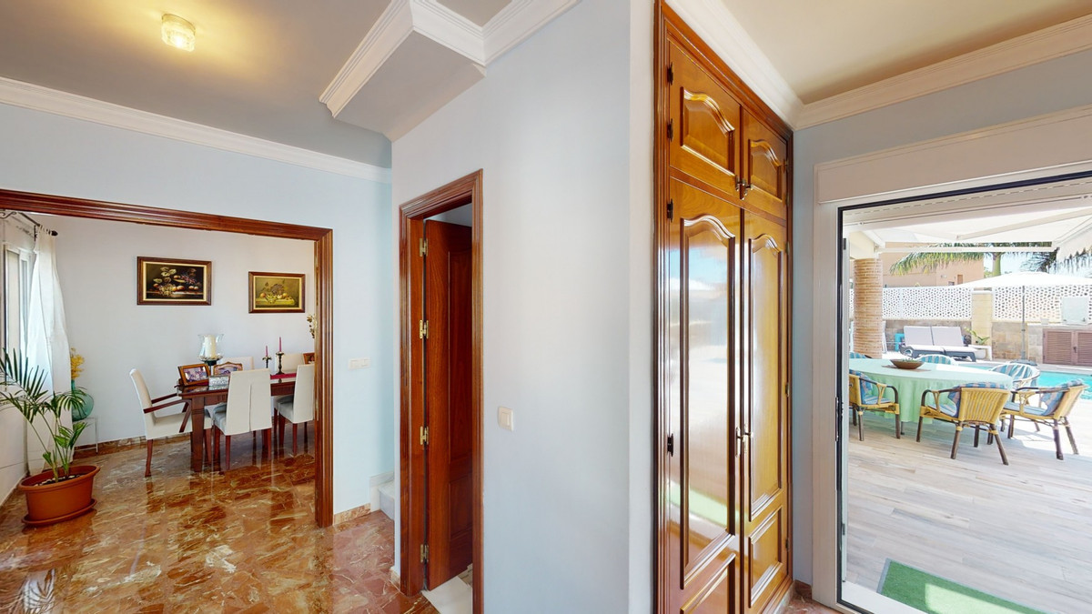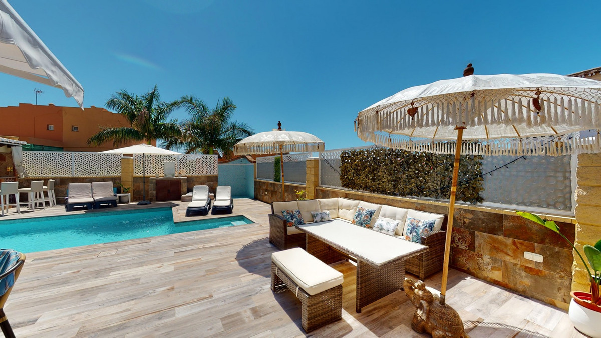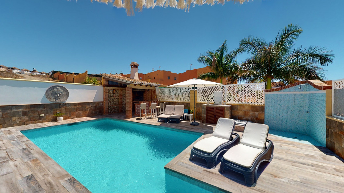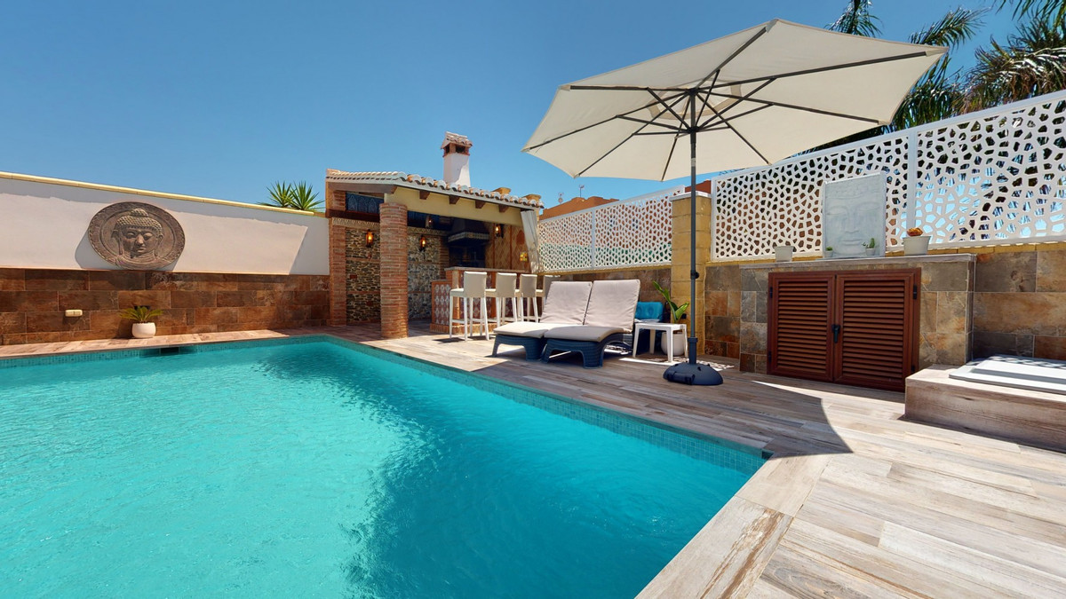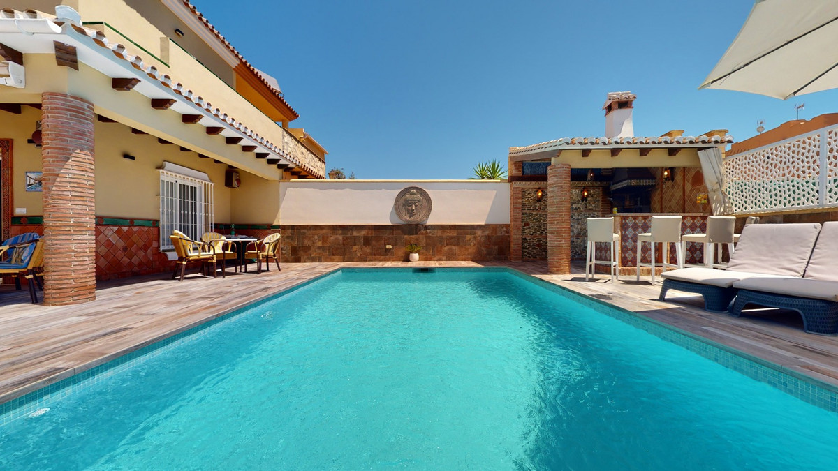 Magnifique maison jumelée rénovée, située dans un quartier résidentiel calme de Viña Malaga. Cette maison de trois étages possède deux entrées. Elle se compose de trois chambres, trois salles de bains, un WC, deux cuisines, un salon et une salle de cinéma. L'espace extérieur offre plusieurs zones de détente, une piscine et une cuisine d'été avec barbecue. Au sous-sol se trouve un garage double, actuellement aménagé en salle de cinéma, ainsi qu'une salle de sport, une cuisine et un WC. Cet espace peut être utilisé pour recevoir des amis ou transformé en appartement indépendant de deux chambres. Un accès direct au rez-de-chaussée se fait depuis le garage. Le rez-de-chaussée comprend un hall d'entrée avec placard, une salle de bains avec douche, une cuisine entièrement équipée avec accès au balcon, ainsi qu'un salon/salle à manger avec cheminée. Le salon donne également accès au bel espace extérieur. Vous y trouverez une grande terrasse avec de nombreux espaces de détente autour de la piscine de 4 x 8 m, une douche extérieure et une décoration soignée. Un bar rustique et un espace barbecue avec eau et électricité complètent cet espace. Le soir venu, l'éclairage crée une ambiance romantique et vous permettra de savourer de merveilleux repas en famille ou entre amis. À l'étage, vous trouverez trois chambres, dont une avec dressing et salle de bains privative. Chaque chambre dispose d'un balcon offrant une vue sur la mer. Construite en 2002, la maison a été récemment rénovée. Ne manquez pas l'occasion de visiter cette magnifique maison mitoyenne, située à seulement 5 minutes de la plage, de l'autoroute et du golf. Nous serons ravis de vous présenter prochainement ce bien d'exception, en personne ou par visite virtuelle. Car ce monde est unique, à l'image de notre Axarquía. En Andalousie. Sur la Costa del Sol. Ici, sous le soleil…