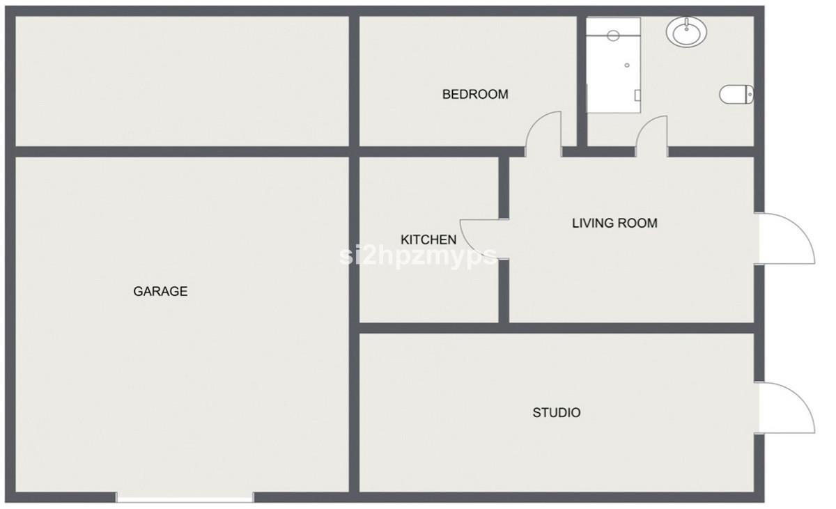 Vous trouverez ici un grand garage pouvant accueillir deux voitures, un studio avec douche, toilettes et cuisine. Juste à côté se trouve un appartement indépendant comprenant une chambre, une salle de bains et une cuisine. Un escalier, accessible par le garage, mène à l'étage et à la maison principale, également accessible par l'entrée principale située de l'autre côté.