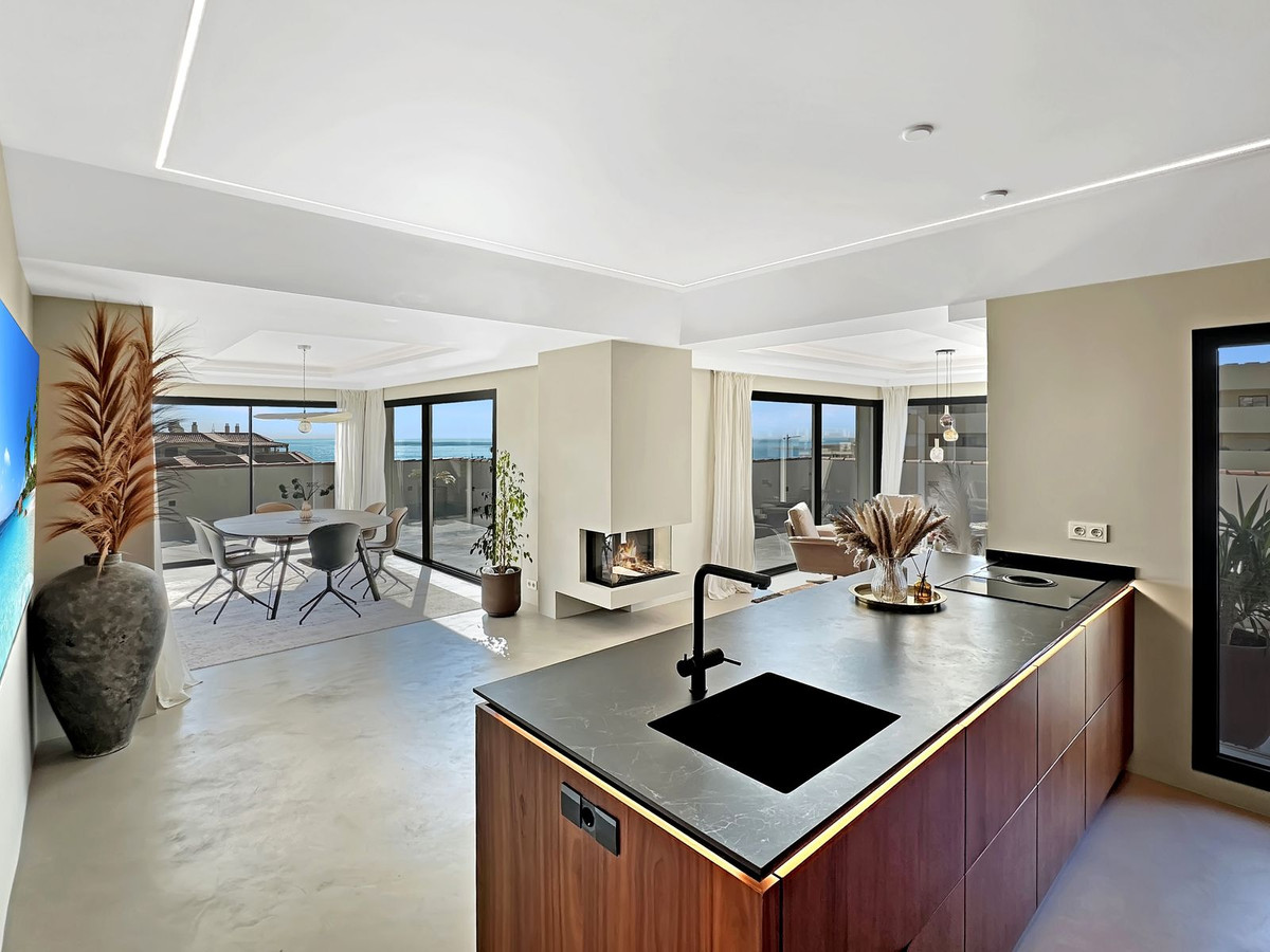 The open-plan layout is the heart of this penthouse. The indoor living space is 118 square meters, featuring a seamless flow between the lounge, dining area, and the stunning kitchen. The kitchen boasts elegant walnut finishes, a composite countertop, fully integrated appliances, and a central kitchen island with an induction cooktop. A cozy fireplace is strategically placed to create a warm and romantic feeling in the open living area on late evenings.
