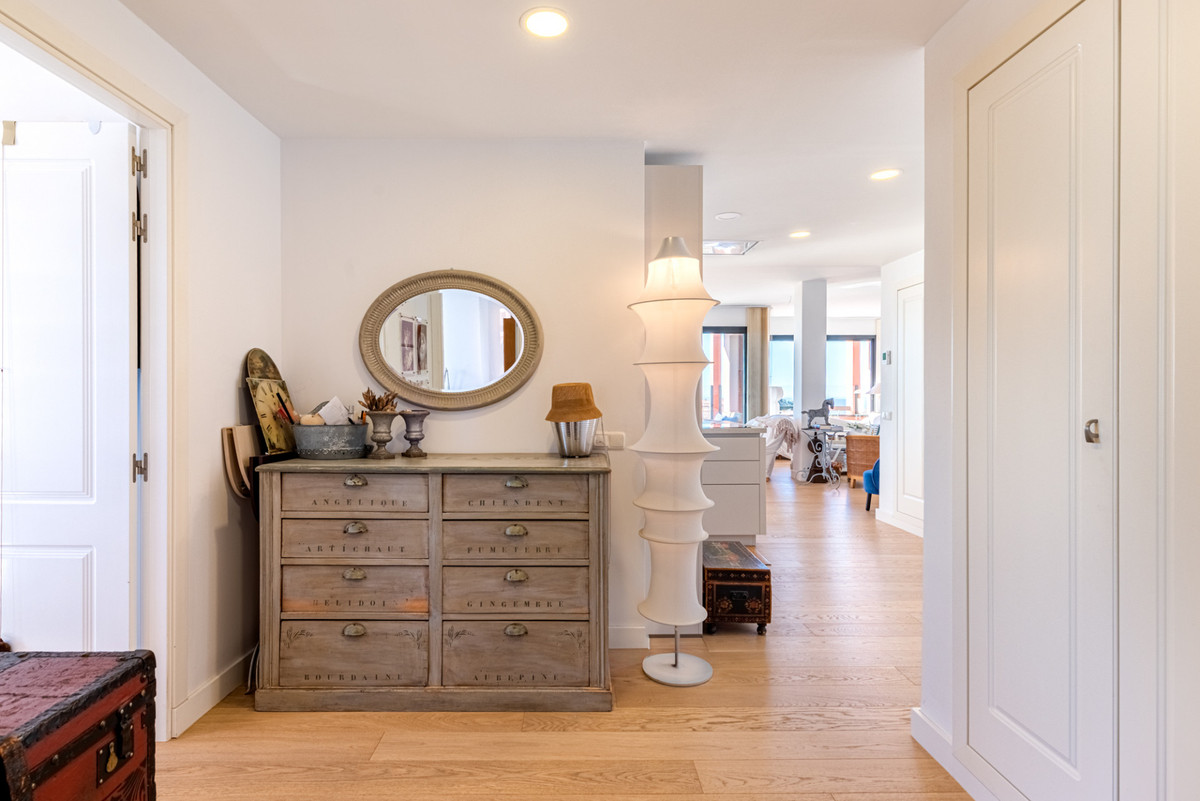 The bedroom area that contains the master bedroom and a second bedroom also has amazing sea views from both bedrooms with direct access to the terrace. One bedroom is “en-suit” with a bathroom with both a bathtub and a shower. The second bathroom in the hallway is having a shower.