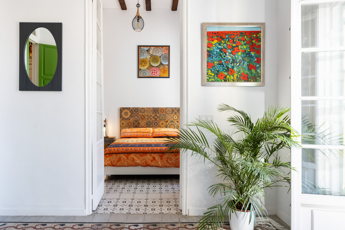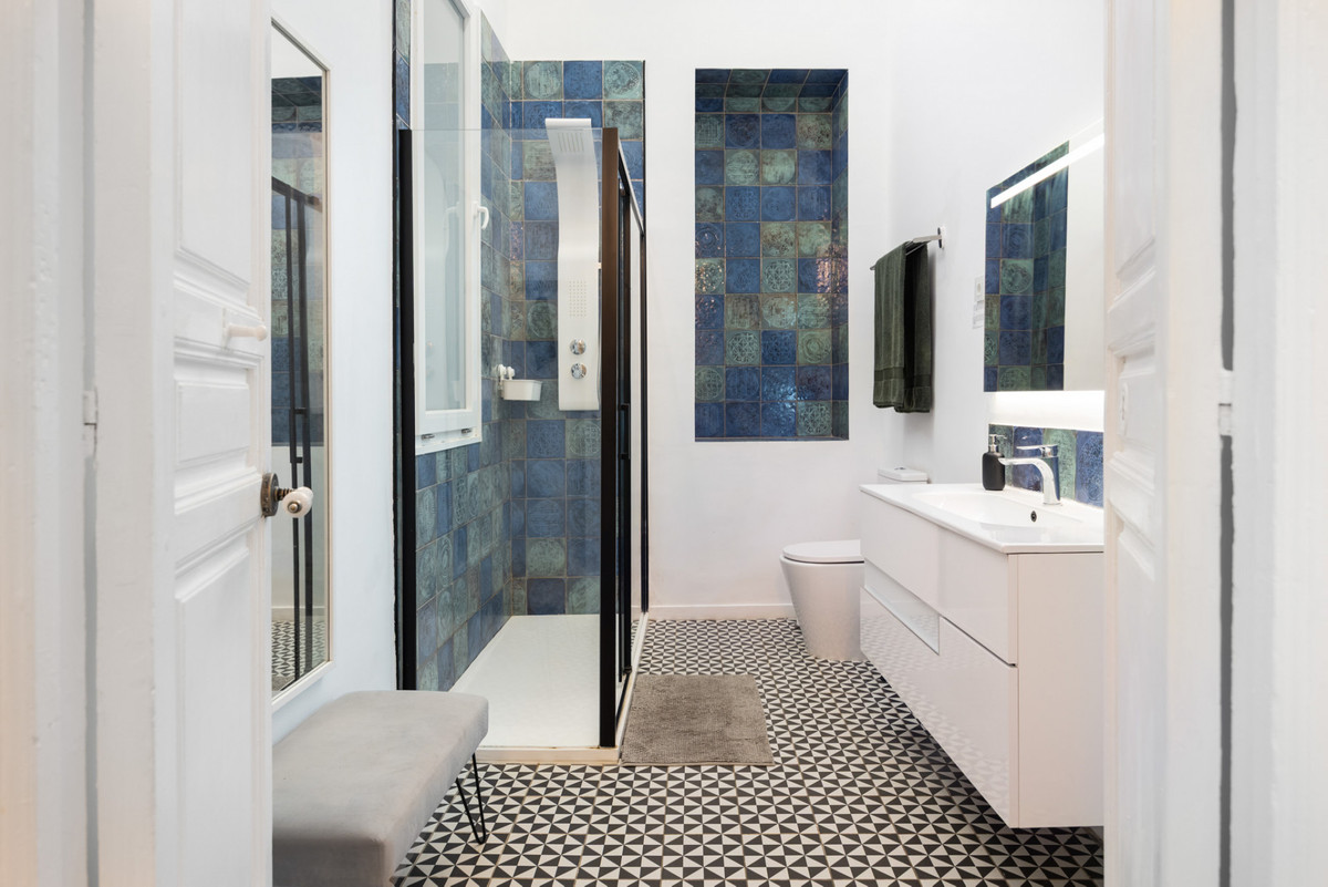 Impressive 4.2-meter-high ceilings with exposed beams, 3-meter doors, and original 19th-century tiles anchor a high-end renovation that honors the building’s heritage while enhancing everyday comfort. The spa-style bathrooms offer generous dimensions and rain-effect showers; central air conditioning serves the entire residence. The versatile layout allows for an independent studio or three-bedroom apartment, at the moment, it's functioning as an Airbnb, making this ideal for guests or additional income as a short-term rental.