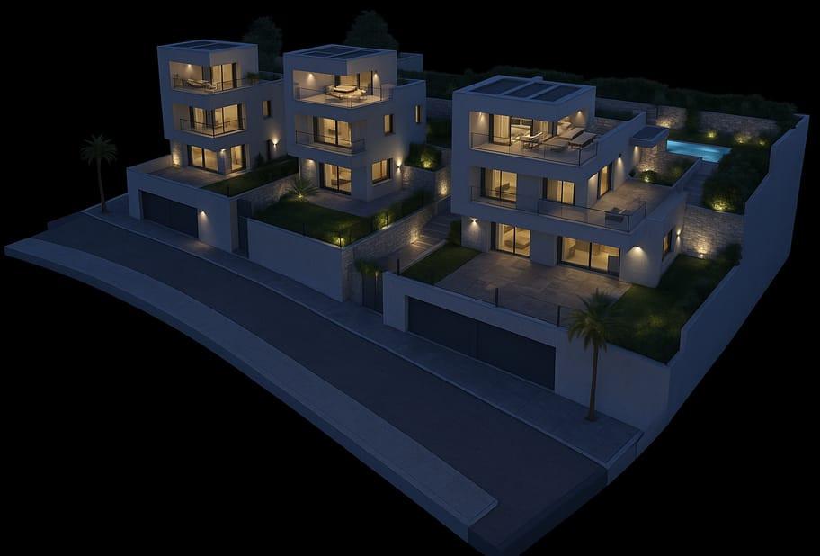 Stunning modern villa offering breathtaking sea, mountain, and urban views. Features include a private lift, garage, versatile lower level for gym, cinema, or extra bedrooms, three en-suite bedrooms with terraces, open-plan living and dining with integrated kitchen, guest toilet, covered porch, private pool, jacuzzi, and rooftop solarium.