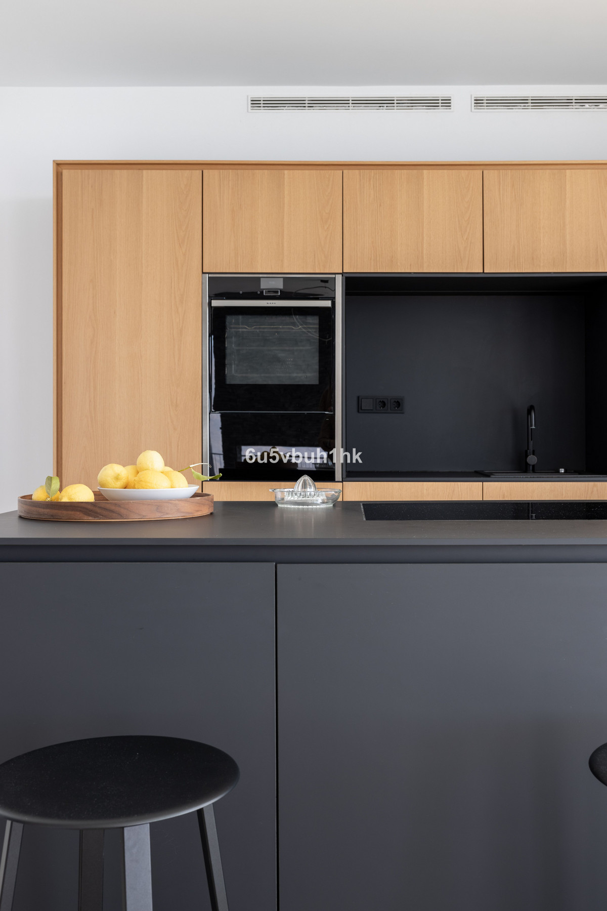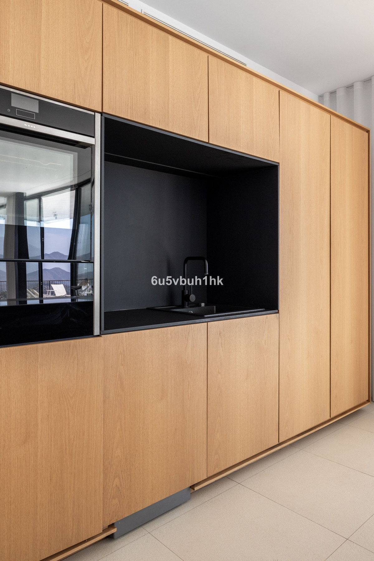 The villa boasts a total built area of 916m², providing an great deal of space both indoor and outdoor. The interior of the property is meticulously designed with high-quality finishes and attention to detail. The open-plan layout of the living areas creates a seamless flow between the kitchen, dining area, and lounge, perfect for entertaining guests. The gym, cinema room and service areas are located on the lower level as well as the outside exterior foyer. Entering the center of the house via the large wooden staircase, you will immediately feel the grand atmosphere. In the living room theres is plenty of space for a lot of cozy evenings in the custom made sofa in front of the big fireplace. Every piece of furniture, light and art is carefully chosen to create a warm feeling from the honey tones of oak, to the big sliding glass doors that at the same time gives you the feeling of indulging in the nature.