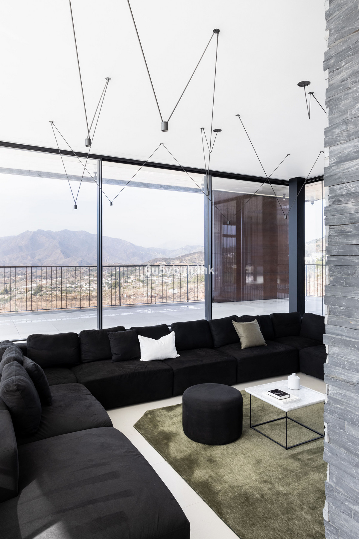 The house itself is organized around a raised viewing platform which is slightly pushed into the top of a hill. The design of the house is a response to both the plot and the amazing surrounding views. The plot is oriented to the south and to the west, with views of the sea and the beautiful mountains and the beautiful pine trees.